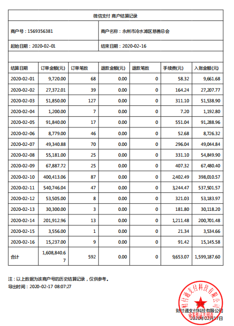 新型冠状病毒感染肺炎疫情发生后,我省进入公共卫生突发事件一级响应,我会积极响应区委区政府号召,及时向社会发出倡议,承蒙全区党政机关(含乡镇街道)及事业单位、社会组织、中央省市驻冷各单位、广大爱心市民的踊跃捐赠,截至2月16日24点,冷水滩区慈善总会接收到捐款5714602.07元,支出432万,剩余1394602.07元。