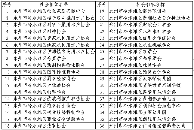 为进一步加大对非法社会组织的打击整治力度,充分发挥社会监督作用,保护社会公众的合法权益,冷水滩区民政局现公布2018年至此公布发布日,先后已经注销的36家社会组织。如发现下列组织仍在活动的,可拨打冷水滩区民政局电话0746-8219219 0746-8219120进行举报或向举报邮箱:(lm8219219@sina.com)提供相关图片、视频和证据材料。