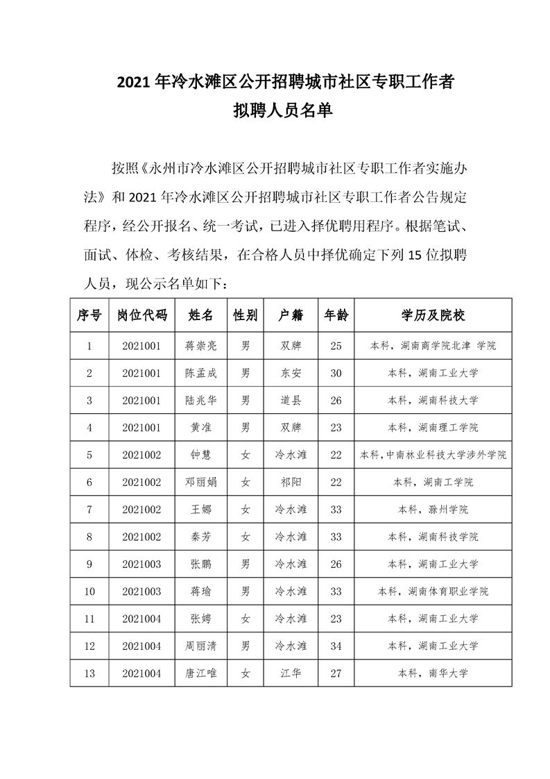 2021年冷水滩区公开招聘城市社区专职工作者拟聘人员名单公示