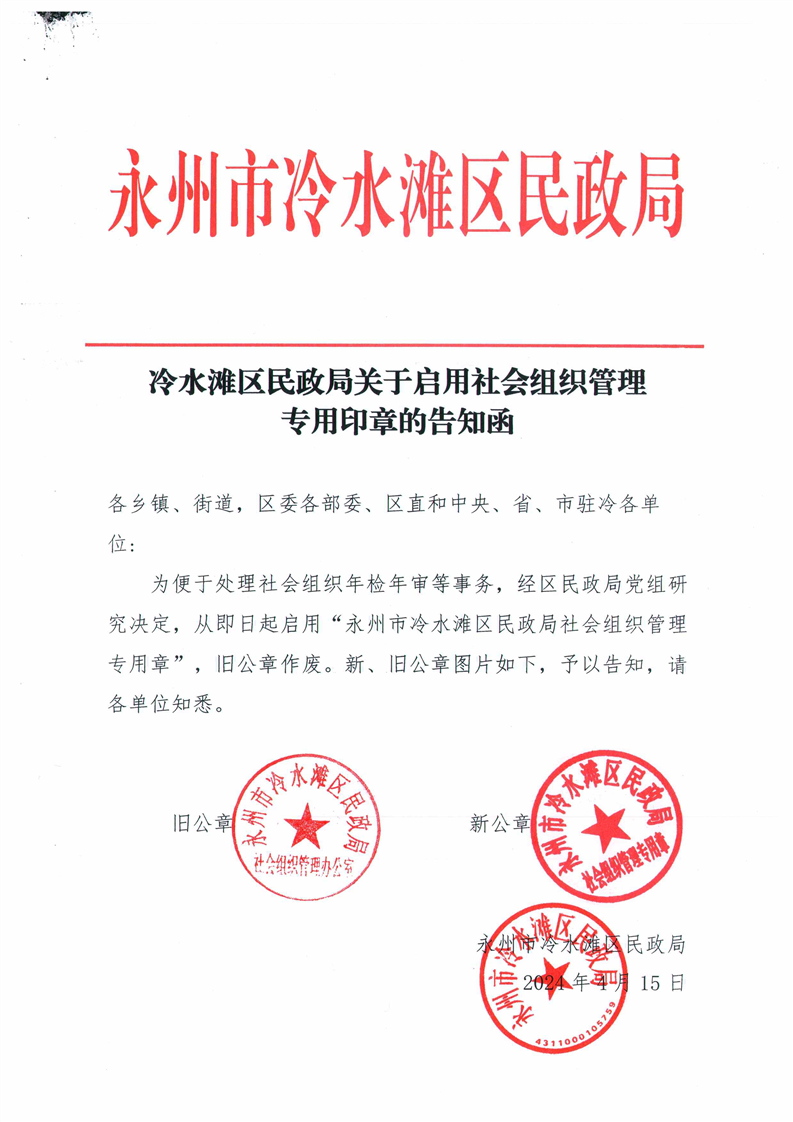 冷水滩区民政局关于启用社会组织管理专用印章的告知函