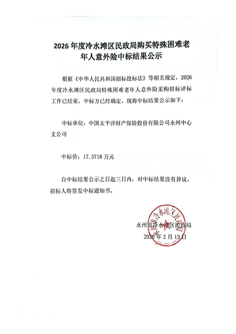 2026年度冷水滩区民政局购买特殊困难老年人意外险中标结果公示