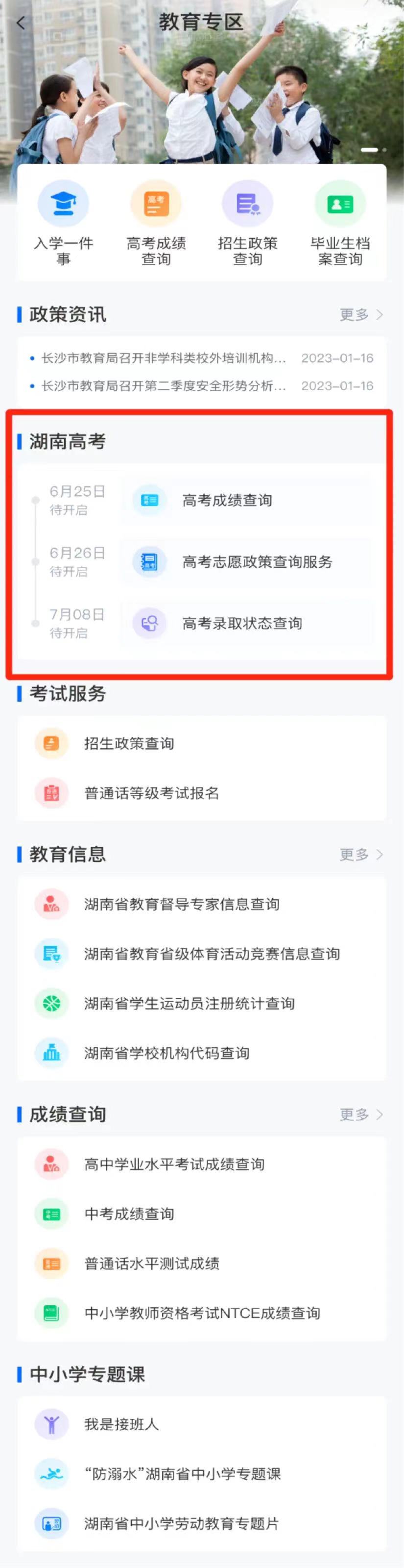 “湘易办”超级服务端“智慧教育”专区全面完成与省政务服务一体化平台对接,联动省教育厅和各市州教育部门,提供考试服务、教育信息、成绩查询、中小学专题课等多种主题服务,用政务服务的温度给每一位学生及学生家长带去关怀。