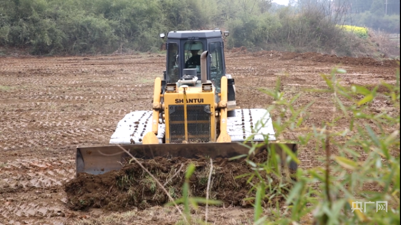石溪坪村高标准农田现场,推土机在田间忙碌(央广网发 王庚娣 摄)