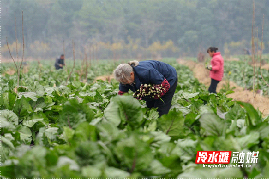 寒冬时节,在永州市冷水滩区伊塘镇永州市智能农业服务有限公司蔬菜种植基地,一畦畦冬季蔬菜郁郁葱葱、生机勃勃,村民正动作娴熟地采收红菜薹,丰收的喜悦扑面而来。