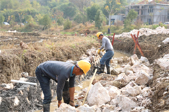 高溪市镇青山洞村的田间,两台挖土机开挖渠道,工人砌筑石块,623米长的灌水渠雏形渐显。该标段还包含泵站配套、山塘整修、机耕路修建等内容。
