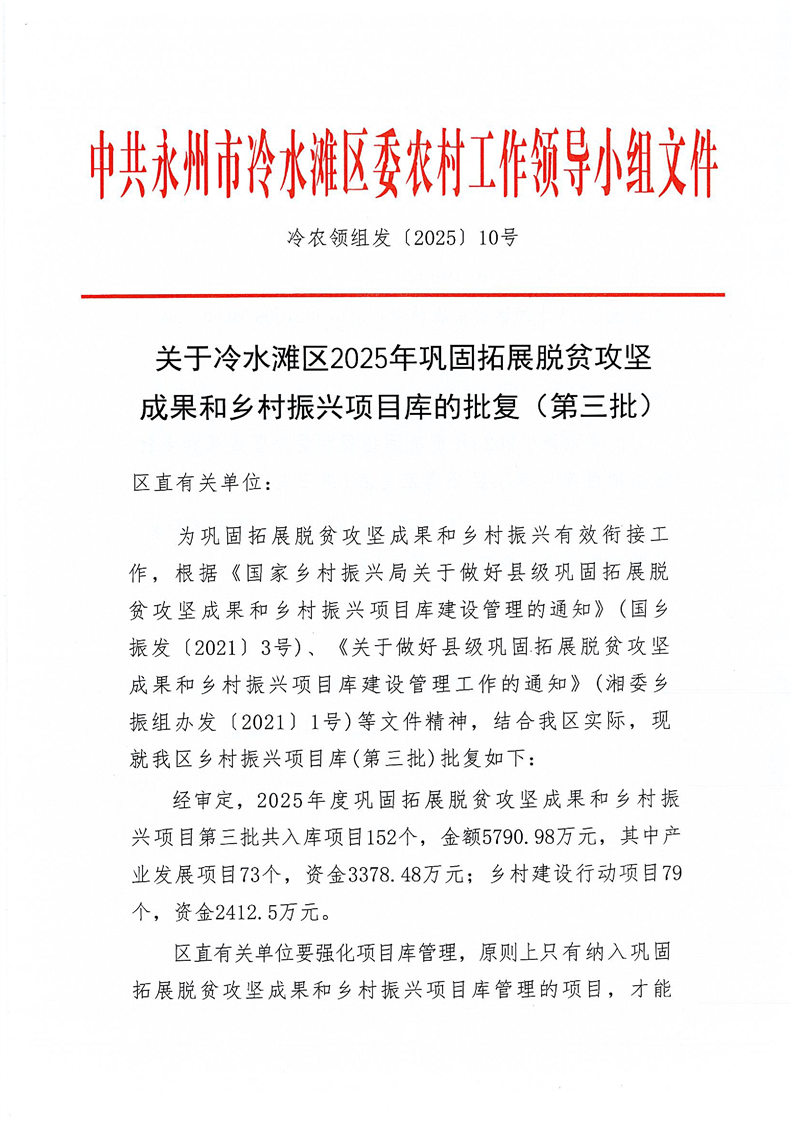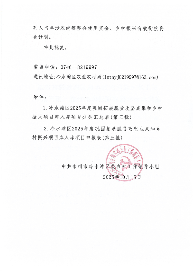 关于冷水滩区2025年巩固拓展脱贫攻坚成果和乡村振兴项目库的批复(第三批)