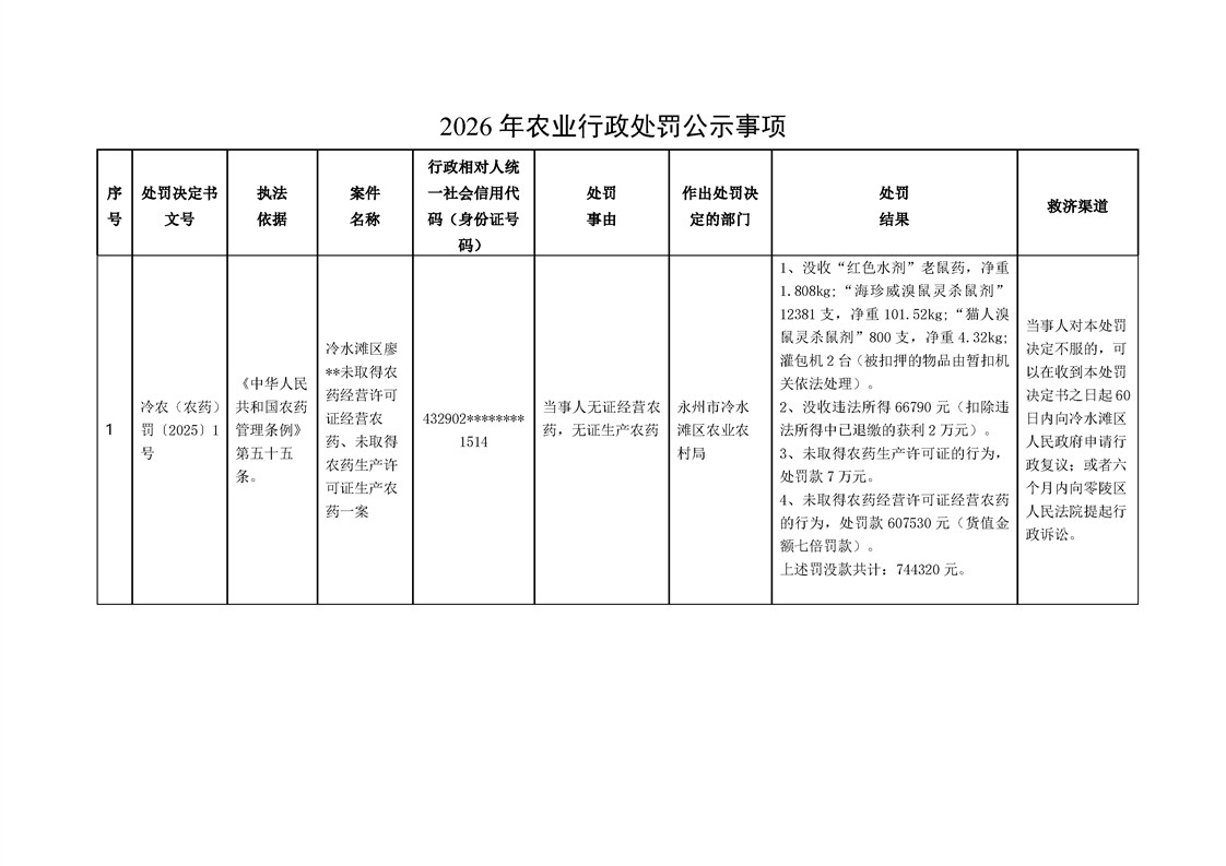 2026年农业行政处罚公示事项