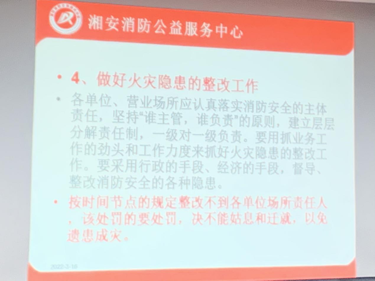 湘安消防公益服务中心谭塘峰教官详细培训了与粮食工作有关的安全教育,结合各单位部署要求,讲解近期发生典型的火灾案例及应急处理方法,提前给大家敲响安全警钟;完善消防“四个能力”建设,真正做到“四懂四会”;加强火灾应急处理能力和消防基础常识,初期火灾的扑灭,火场人员疏散及逃生技能知识及重点注意事项;消防设备的正确使用,火灾事故的善后处理;火灾隐患的排查手段,协助单位彻底清查火灾及突发安全事故发生的原因,做到“四不放过”原则。引领大家学习安全生产法律法规、企业的安全生产规章制度、操作规程,并开展警示教育,强化安全作用,讲座完成后组织观看《生命重于泰山》、《不可逾越的红线》等,以案为鉴,警钟长鸣。