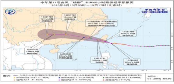 今年第11号台风“杨柳”已于今天(13日)早晨加强为强台风级,早晨5点钟其中心位于台湾台东市东偏南方向大约170公里的西北太平洋洋面上,就是北纬22.0度、东经122.6度,中心附近最大风力14级(42米/秒),中心最低气压955百帕,七级风圈半径为170~320公里,十级风圈半径为80~100公里,十二级风圈半径为50公里。