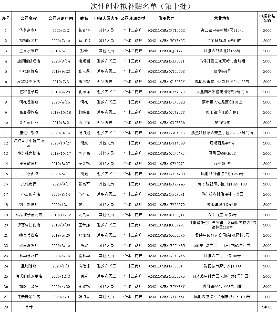 根据《湖南省财政厅 湖南省人力资源和社会保障厅关于印发<湖南省就业专项资金管理办法>的通知》(湘财社〔2018〕25号)、《湖南省进一步促进就业工作二十条措施》(湘政发〔2018〕30号)、《冷水滩区贯彻落实<永州市进一步促进就业工作二十三条措施〉实施细则》(冷政发〔2019〕6号)以及《关于贯彻落实促就业稳就业相关政策的具体操作办法》(冷人社发〔2020〕11号)等文件中的有关政策要求,经区人社局、区财政局审核,华冬制衣厂等27家公司符合一次性创业补贴申报条件,拟拨付一次性创业补贴,现予以公示,公示期7个工作日,自2021年12月 13 日至12月20日,接受社会各界监督,如有问题、意见和建议,请于公示期间向冷水滩区人力资源和社会保障局反映。电话:0746-8219310。