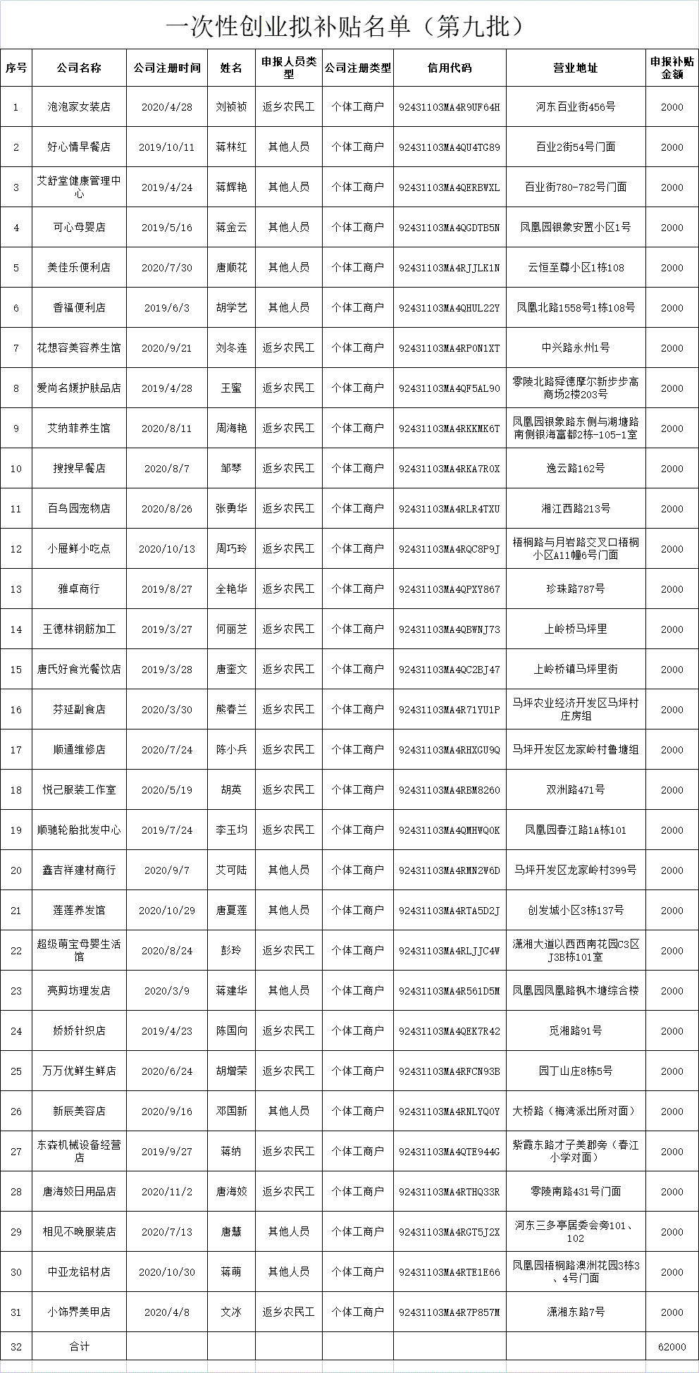 根据《湖南省财政厅 湖南省人力资源和社会保障厅关于印发<湖南省就业专项资金管理办法>的通知》(湘财社〔2018〕25号)、《湖南省进一步促进就业工作二十条措施》(湘政发〔2018〕30号)、《冷水滩区贯彻落实<永州市进一步促进就业工作二十三条措施〉实施细则》(冷政发〔2019〕6号)以及《关于贯彻落实促就业稳就业相关政策的具体操作办法》(冷人社发〔2020〕11号)等文件中的有关政策要求,经区人社局、区财政局审核,泡泡家女装店等31家公司符合一次性创业补贴申报条件,拟拨付一次性创业补贴,现予以公示,公示期7个工作日,自2021年11月 11日至11月19日,接受社会各界监督,如有问题、意见和建议,请于公示期间向冷水滩区人力资源和社会保障局反映。电话:0746-8219310。