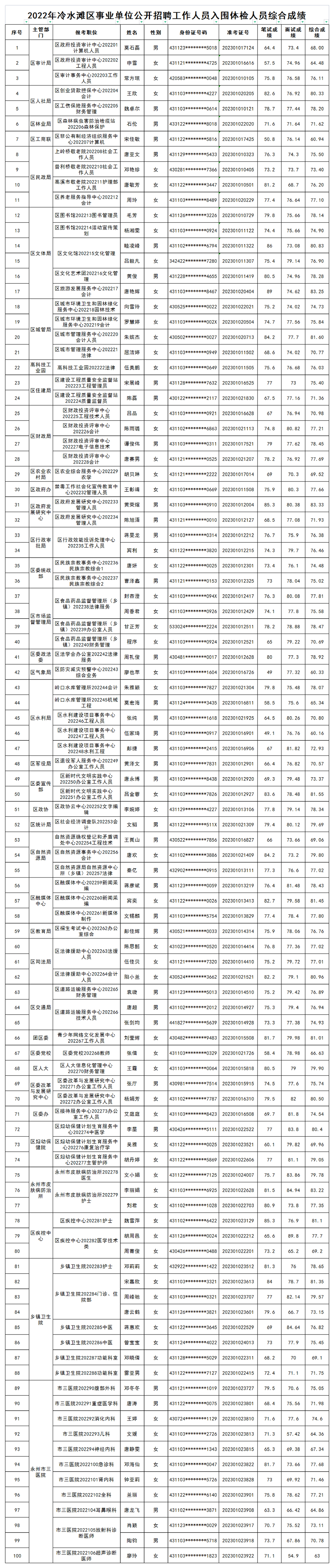 所有入围体检人员的综合成绩见附表《2022年冷水滩区事业单位公开招聘工作人员入围体检人员综合成绩》。