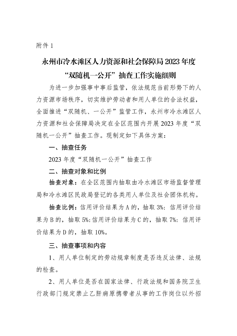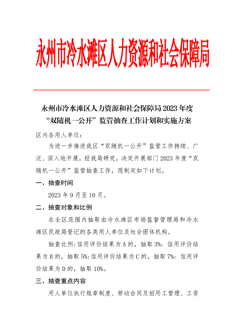 永州市冷水滩区人力资源和社会保障局2023年度“双随机、一公开”监管抽查工作计划和实施方案