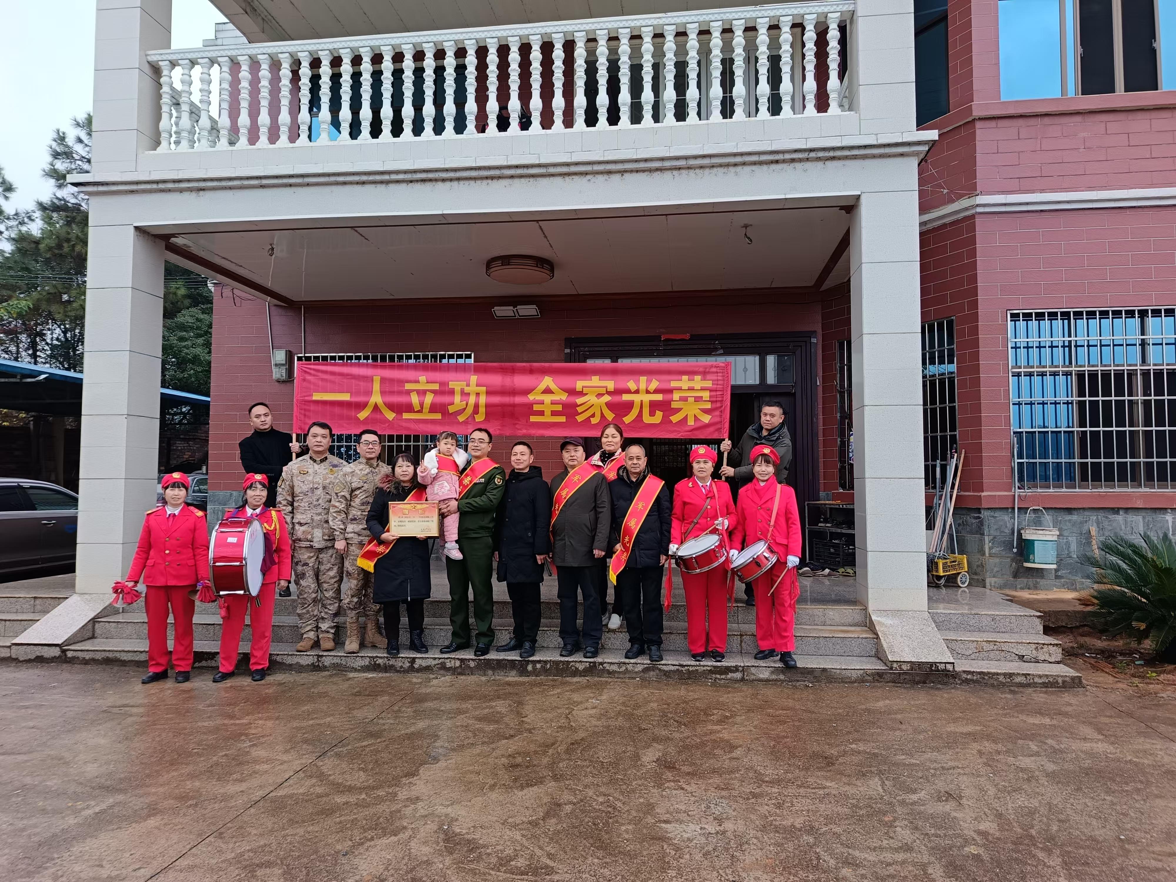 一人当兵,全家光荣。12月11日,在珊瑚街道珍珠塘村玉山杨家组,伴随着欢庆的锣鼓声,军地领导为现役军人刘江的家人披上荣誉绶带,并送上立功喜报和奖励金,并问候军人军属带去冷水滩区人武部和区退役军人事务局的关心关爱。