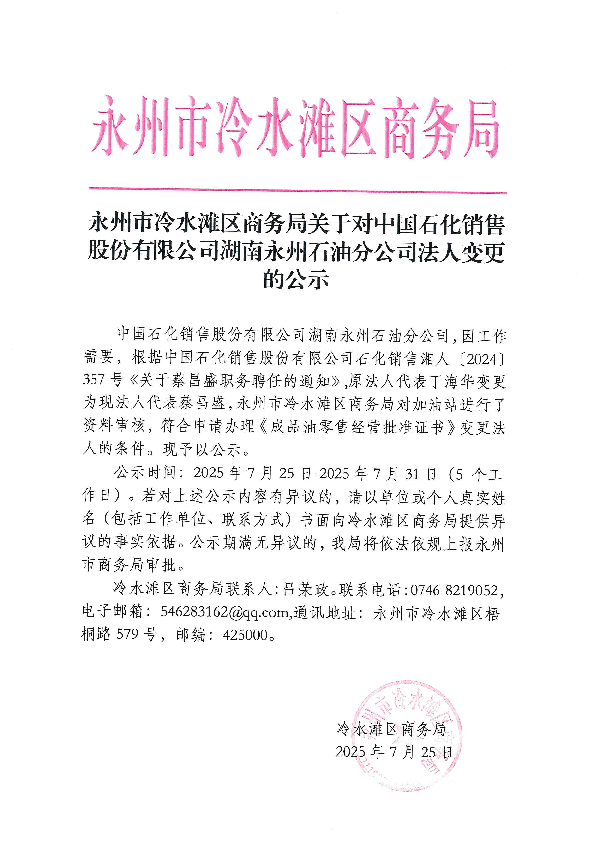 永州市冷水滩区商务局关于对中国石化销售股份有限公司湖南永州石油分公司法人变更的公示