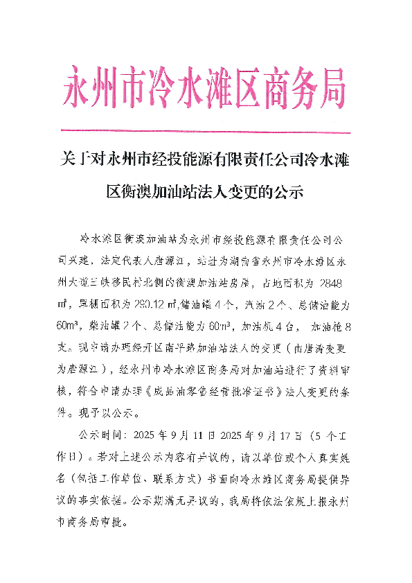 关于对永州市经投能源有限责任公司冷水滩区衡澳加油站法人变更的公示