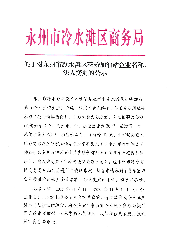 关于对永州市冷水滩区花桥加油站企业名称法人变更的公示