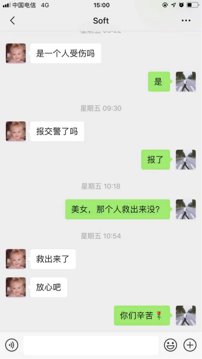 大约二十分钟后,消防救援、120急救、交警先后赶到了现场,看到专业救护人员开始着手救援后,大家便悄然离开。离开现场后,我们通过微信联系救护人员得知,人已经救出,大家都松了一口气。