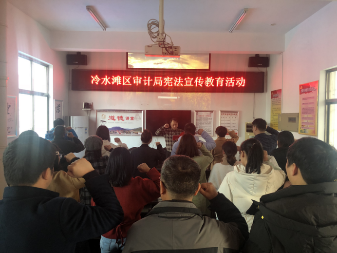 日下午,冷水滩区审计局举行了宪法宣誓仪式,并组织工作人员学习宪法知识。冷水滩区审计局作为执法部门,带头遵法学法守法用法,增强宪法法律意识,依宪依法依规履行审计职责。