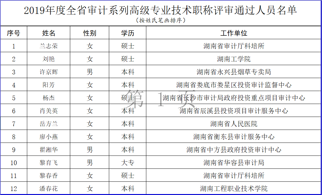 经省审计系列高级专业技术职称评审委员会2019年12月13日评审通过,并经省职称改革工作领导小组备案,同意确认杨杰等12名人员审计系列高级专业技术职称(名单附后),其职称确认时间为2019年12月30日。