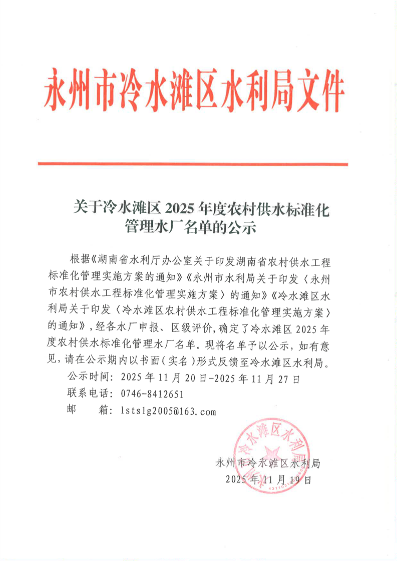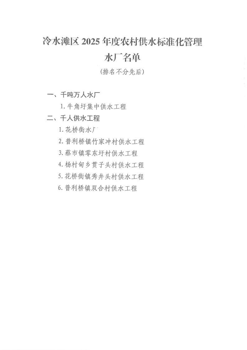 关于冷水滩区2025年度农村供水标准化管理水厂名单的公示