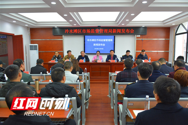 新闻发布会上,冷水滩区市场监督管理局党组书记唐春涛发布新闻,冷水滩区市场监管局领导班子分别就投诉热线整合、小区电梯安全专项整治、“放心豆腐”创建工程等问题答记者问。冷水滩区市场监管局、公安分局、人民检察院还联合发布了永州市冷水滩区生燕卤菜店生产、销售有毒有害食品案相关信息。