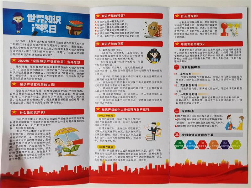 4月21日,冷水滩区在万达国际广场启动2022年“知识产权宣传周”宣传活动,冷水滩区市场监管、检察、公安等多个部门集中围绕“尊重、保护、创新,全面开启知识产权强省建设新征程”的主题,通过设置宣传台、悬挂横幅、发放宣传资料以及现场接受咨询等方式,向广大群众介绍什么是知识产权、知识产权的特点、注册商标专用权的保护、对商标侵权行为的处理,以及地理标志保护等相关知识。活动现场解答群众问题100余人次,发放《中华人民共和国商标法及商标法实施条例》《知识产权普及读本》《中华人民共和国专利法》等宣传资料近1000份。
