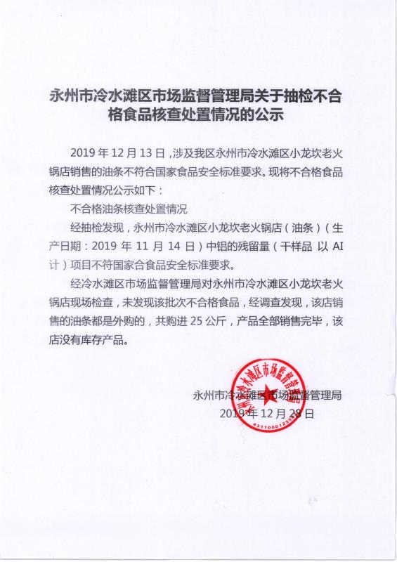 2019年12月13日,涉及我区永州市冷水滩区小龙坎老火锅店销售的油条不符合国家食品安全标准要求。现将不合格食品核查处置情况公示如下: