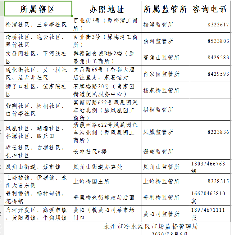 根据《永州市一件事一次办改革实施方案》、永州市冷水滩区人民政府《关于向乡镇(街道)下放部分经济社会管理权限的通知》及永州市市场监督管理局《关于全面推行食品药品经营“证照合一”改革试点的实施方案(试行)》文件精神,为做好对采取“告知承诺制”的后置监管及“多证合一”集中现场核查工作,办事群众达到就近办的目的,现决定从2020年8月10日起将个体工商户登记、食品经营许可(含小餐饮经营许可)、农民专业合作社登记办理下放至各辖区监管所,具体公告如下。