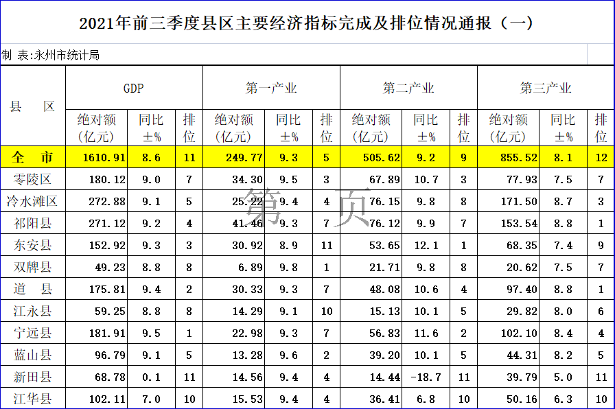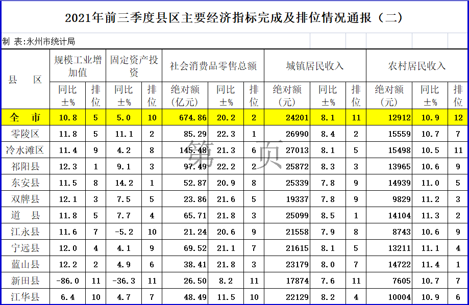 2021年前三季度县区主要经济指标完成及排位情况通报