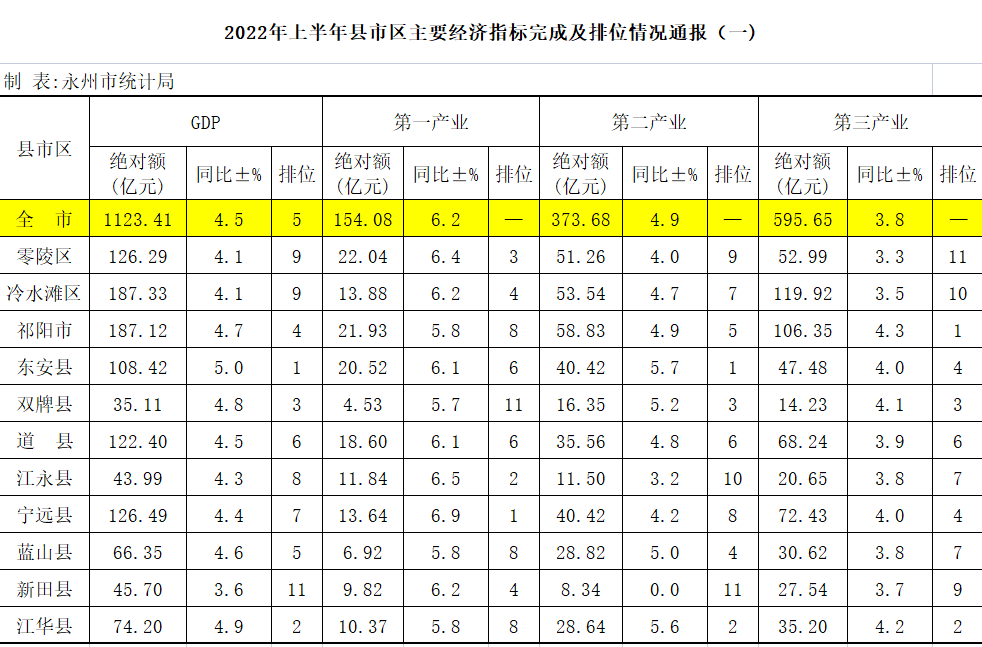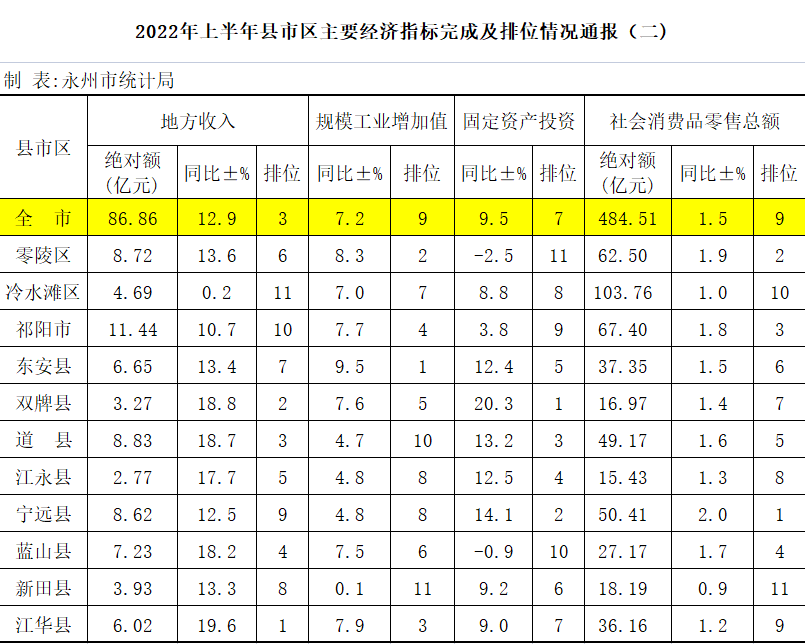 2022年上半年县市区主要经济指标完成及排位情况通报