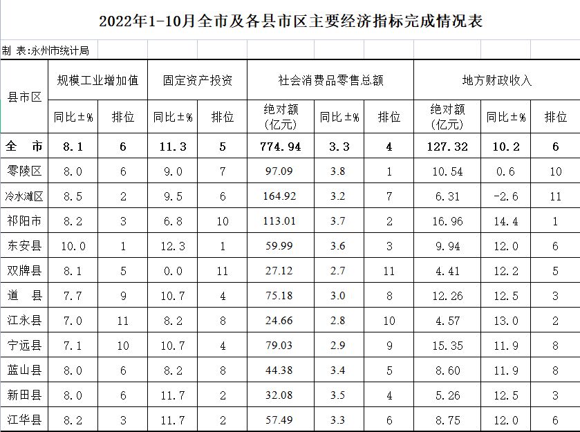 2022年1-10月全市及各县市区主要经济指标完成情况表
