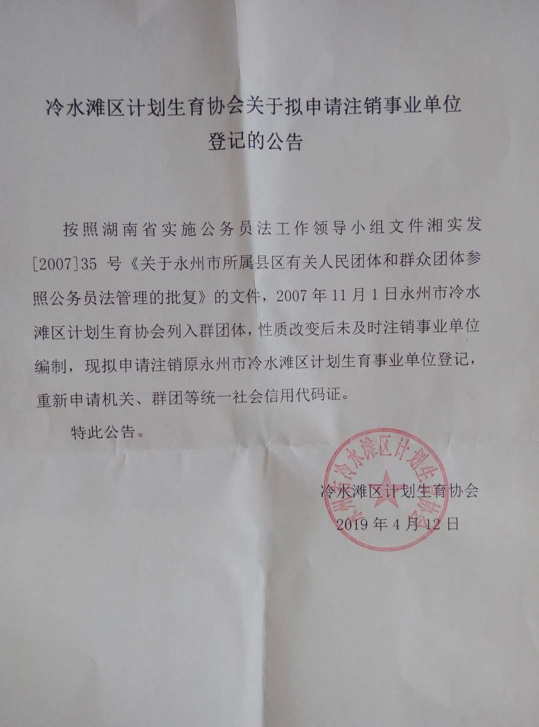 冷水滩区计划生育协会关于拟申请注销事业单位登记的公告