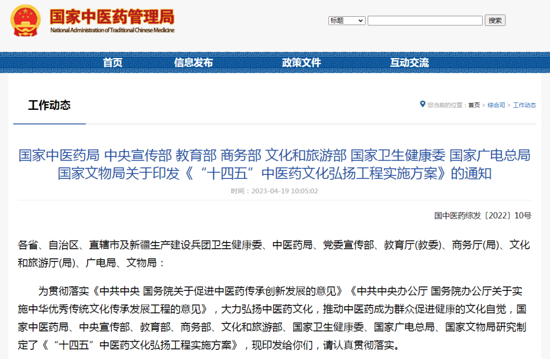 近日,国家中医药管理局、中央宣传部、教育部、商务部、文化和旅游部、国家卫生健康委、国家广电总局、国家文物局联合印发《“十四五”中医药文化弘扬工程实施方案》(以下简称《方案》),推动部署“十四五”期间中医药文化建设工作。