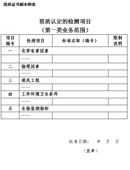 六、资质证书副本附表,由资质认可机关填写检测项目批准情况并盖章。