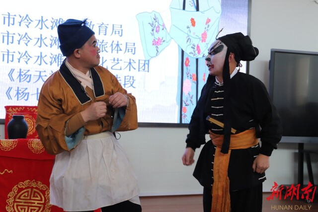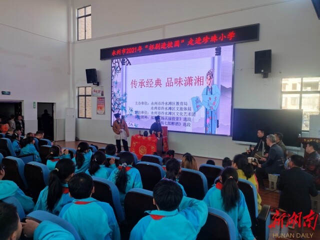 湖南日报·新湖南客户端12月3日讯(通讯员 蒋爱国 熊敏)感受祁剧韵味,传承经典文化。12月3日下午,永州市2021年“祁剧进校园”活动在冷水滩区珍珠小学举行,本次活动由冷水滩区教育局、区文旅体局主办,区文化艺术团的演员们为孩子们带来了祁剧《杨七郎醉酒》选段、《杨天禄投亲》选段等节目。