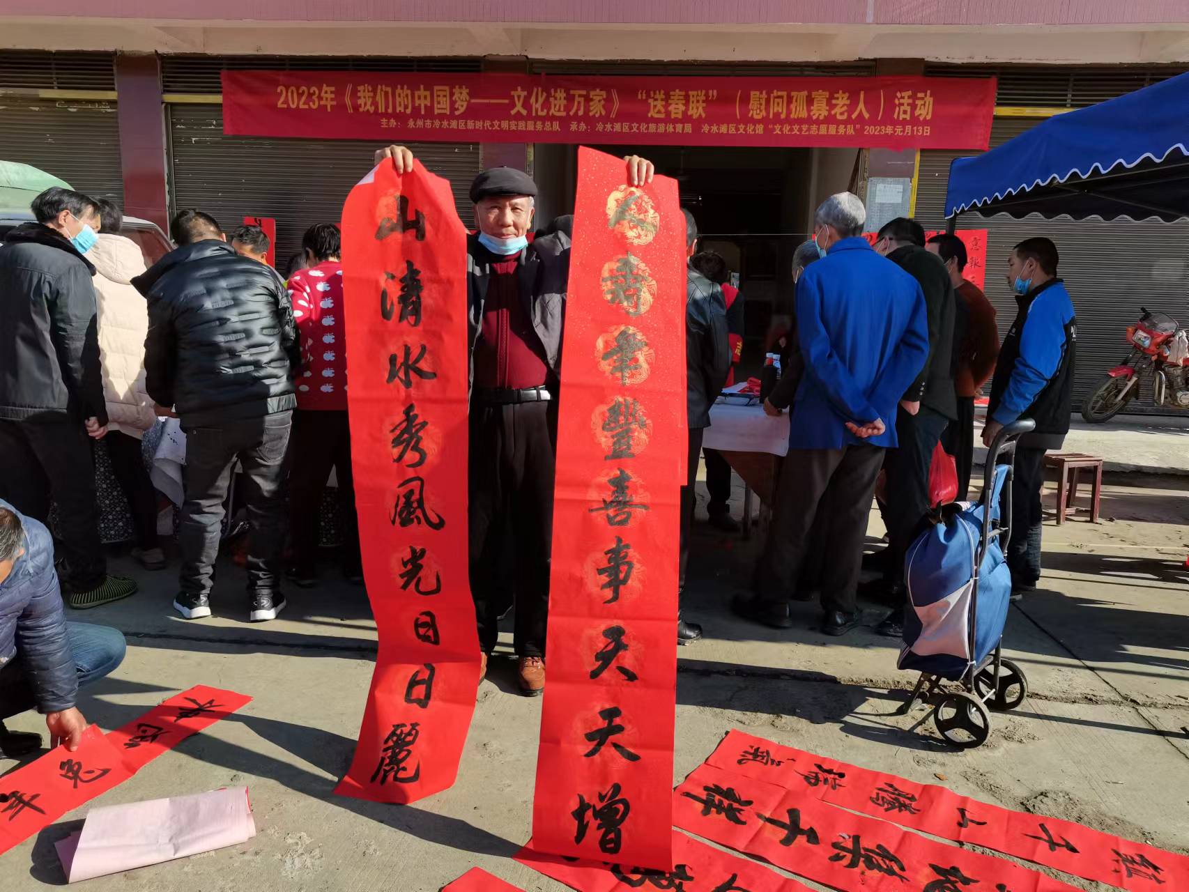 1月13日上午,正值冷水滩普利桥镇赶大集的日子。由永州市冷水滩区新时代文明实践志愿服务总队主办,普利桥镇政府、冷水滩区文化旅游体育局及冷水滩区文化馆承办的“我们的中国梦—文化进万家”慰问孤寡老人主题活动在普利桥镇农贸市场内举行。