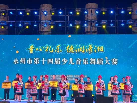 近日,永州市第十四届少儿音乐舞蹈大赛在宁远县圆满落幕。本次大赛自五月份启动以来,全市11个县(市)区一万六千名少年儿童报名参赛,经过层层选拔,全市共选出92个节目,近两千多名小选手进入市复赛。7月29日,经过一天的复赛,精选出音乐组12个节目,舞蹈组14个节目,近四百名小选手进入30日的决赛。当晚,经过三个多小时的激烈角逐,最终决出10个金奖,16个银奖。经过层层选拔与激烈角逐,冷水滩区代表队的小选手们在这场全市瞩目的赛事中奋勇争先,凭借扎实的功底与亮眼的表现脱颖而出,最终斩获1金2银4铜的佳绩,为冷水滩区赢得了荣誉。