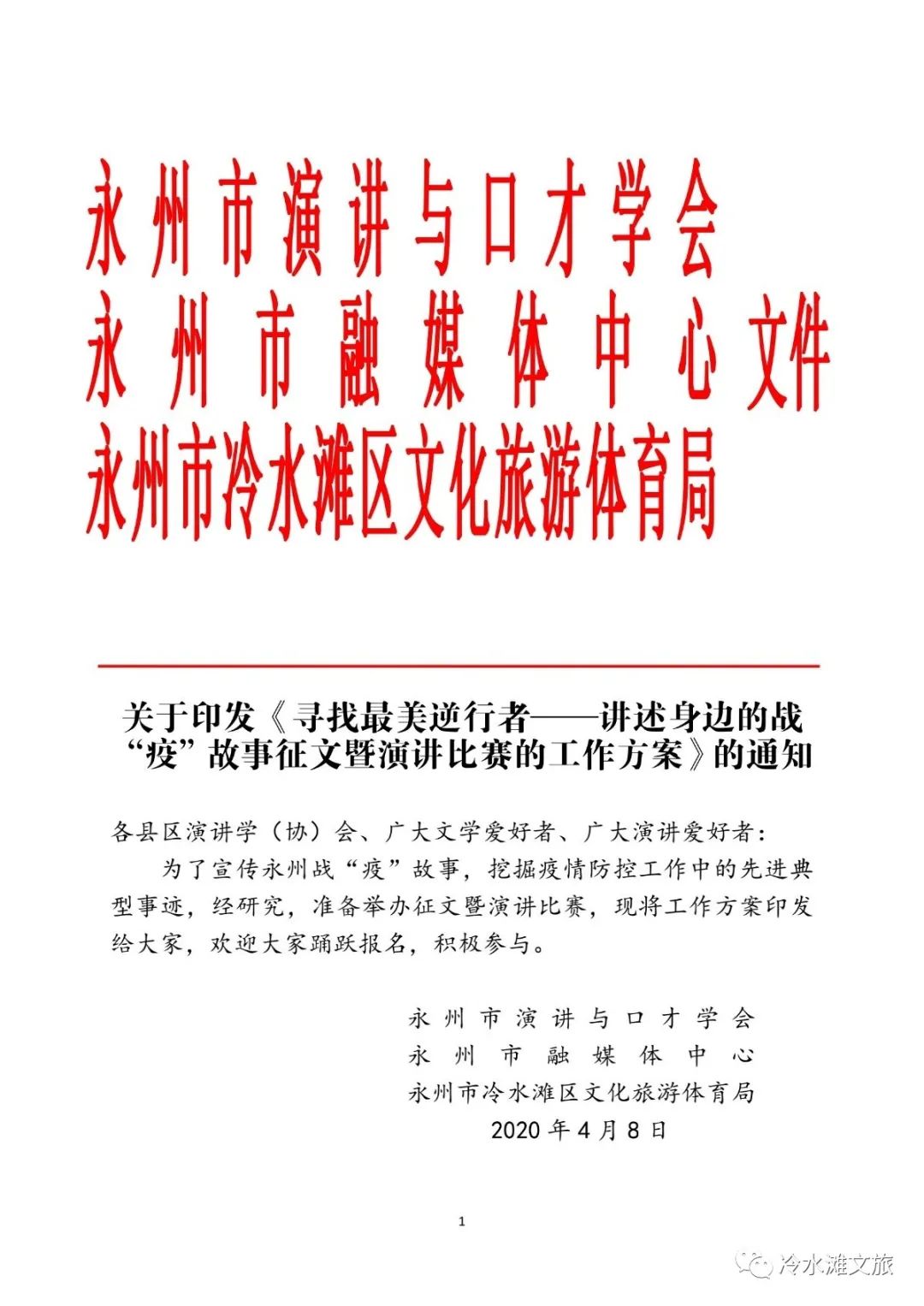 新冠肺炎疫情发生以来,无数“最美逆行者”冲在前线,从战“疫”一线的医护人员,到街道社区的工作人员、志愿者、公安民警、电网工人、乡镇干部等,再到患者、每个家庭,上至党政机关、院校、社区,下至乡镇、村落等各行各业、各条战线都有着感人的先进事迹和故事。“弘扬真善美,传播正能量”,永州市“寻找最美逆行者——讲述身边的战‘疫’故事”征文暨演讲比赛正式启幕。