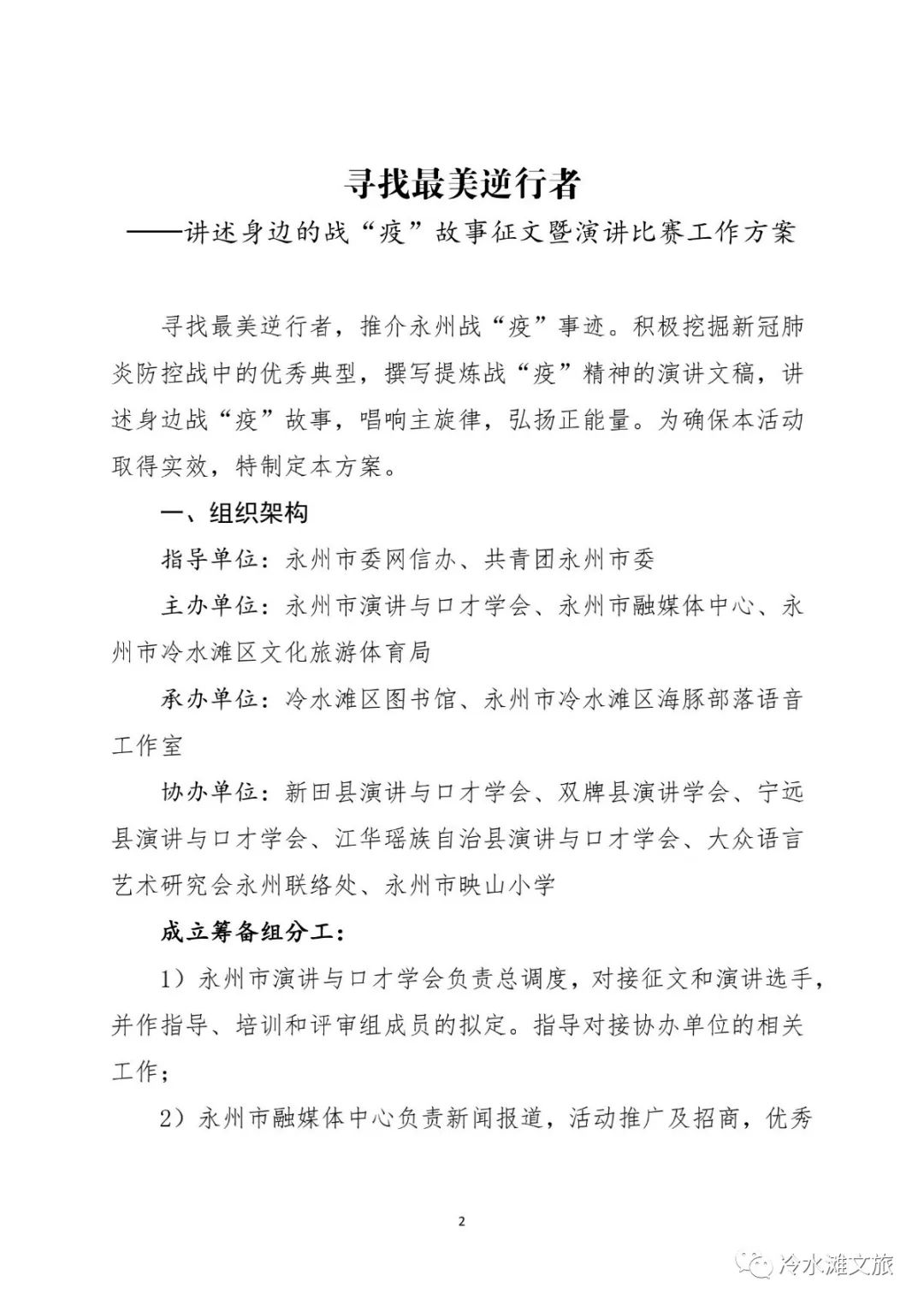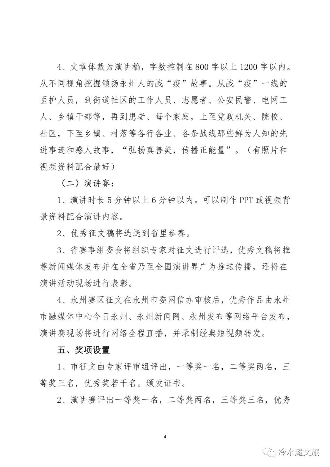 大赛分为讲稿征文比赛与演讲比赛两大项,征文体裁为演讲稿,字数控制在800字以上1200字以内,从不同视角挖掘颂扬永州人的战“疫”故事。