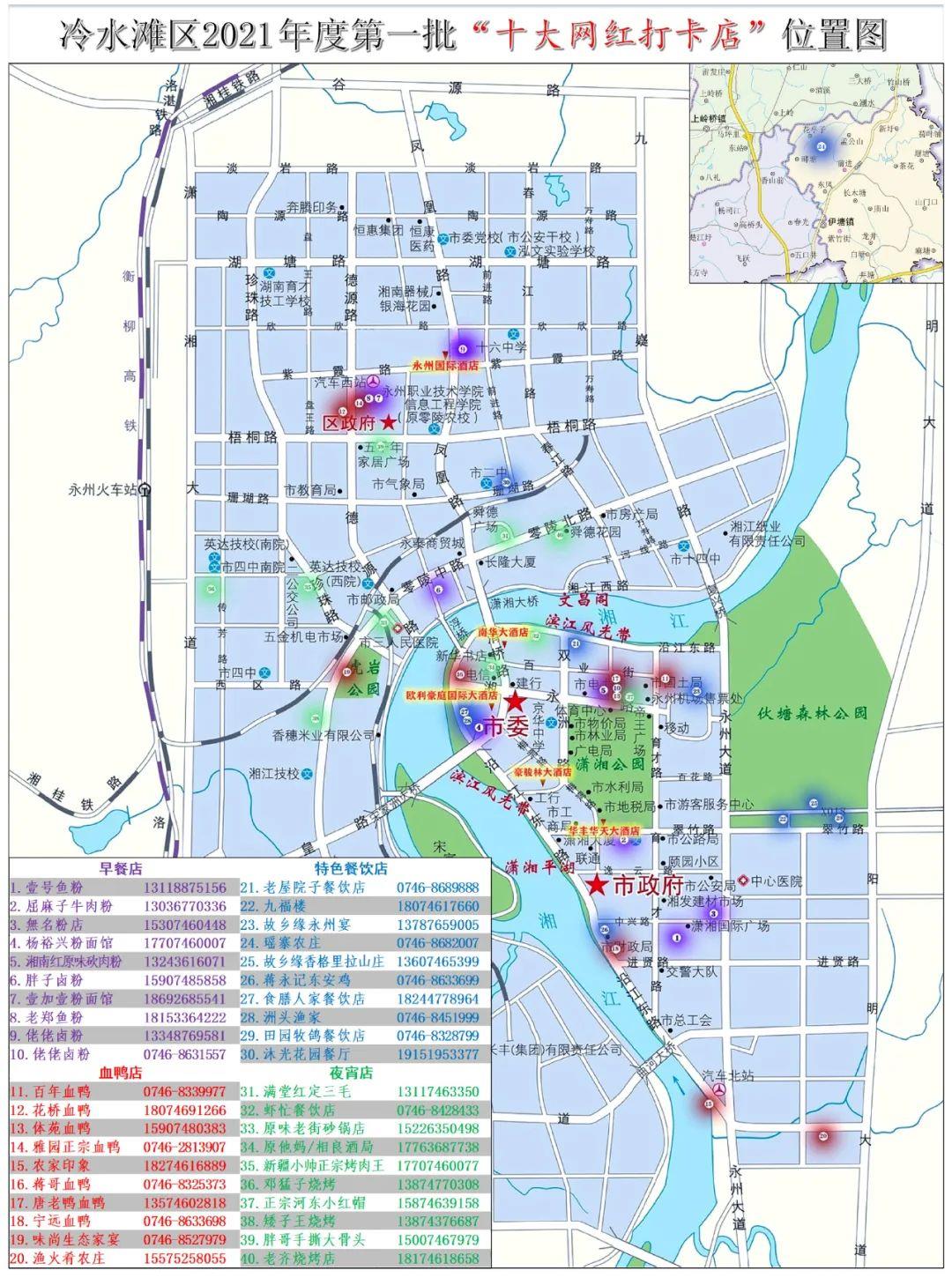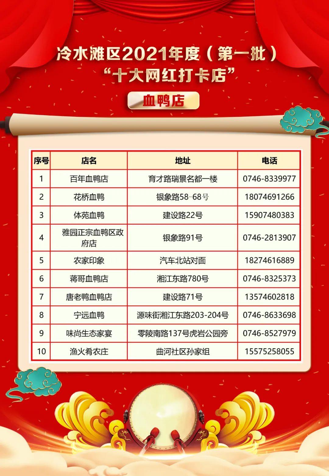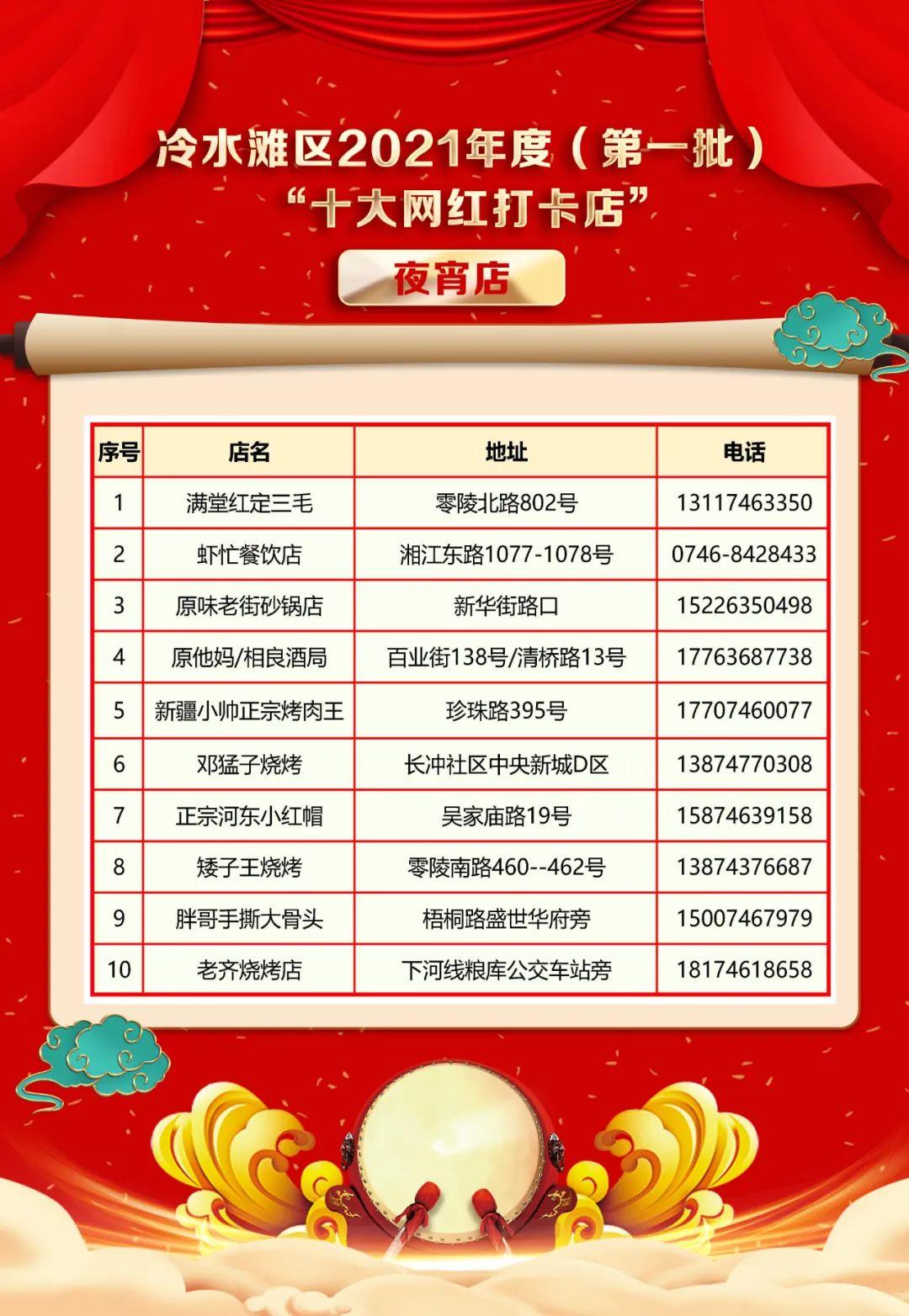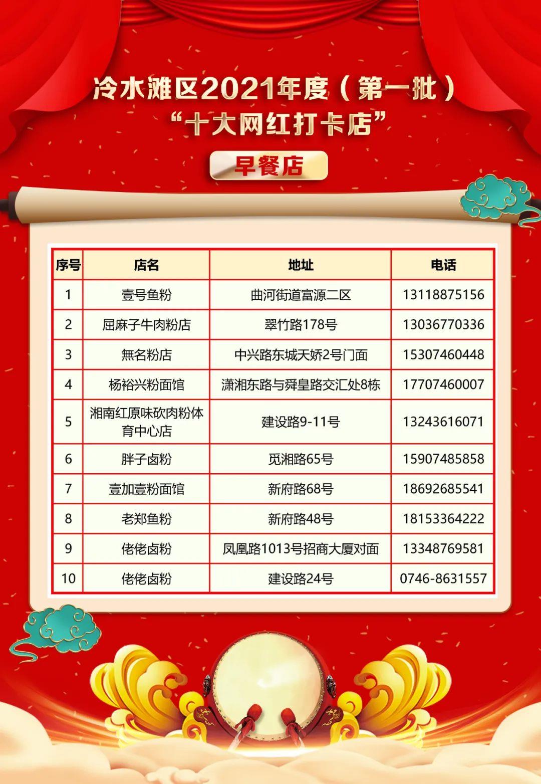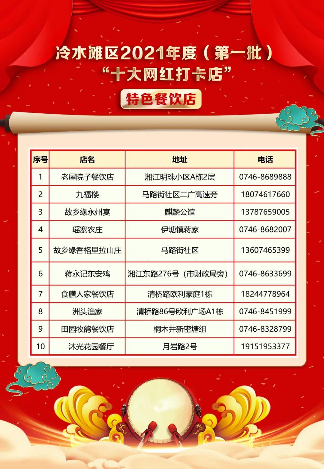 经宣传报名、专家初审、职能部门审核、网络票选、专家复审、公示等环节,正式确定冷水滩区2021年度(第一批)“十大网红打卡店”推介名单,现公布如下: