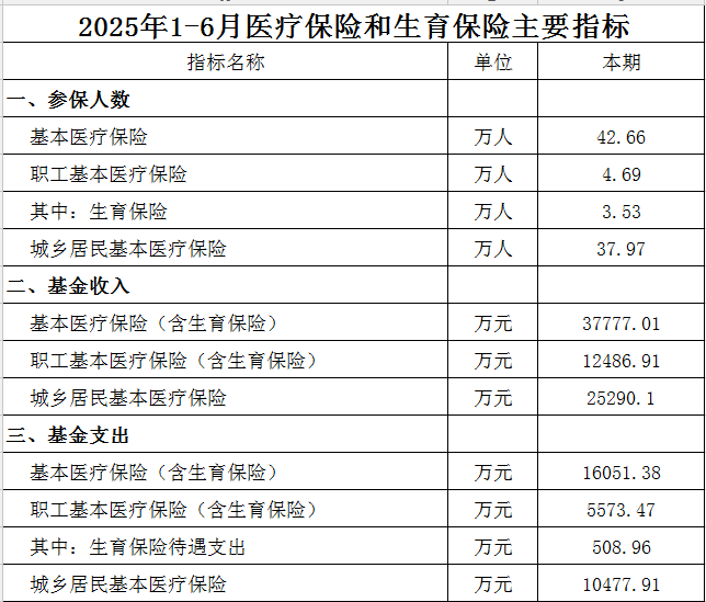 2025年1-6月医疗保险和生育保险主要指标