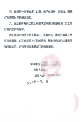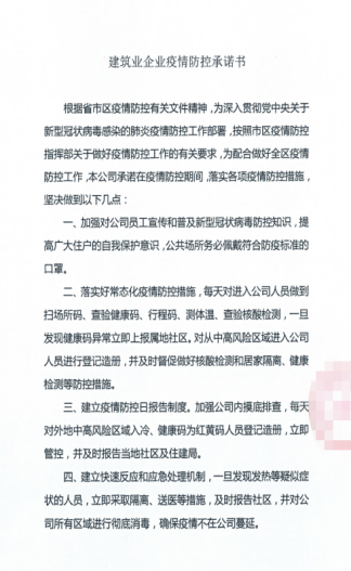 二是签订一份承诺书。与各在建项目施工单位、各建筑企业、物业企业等签订了建筑领域疫情防控工作落实承诺书,要求各企业负责人和项目法人严格落实承诺事项,对拒不执行或拖沓执行的依规严格追责处罚。一是要求落实好常态化防控措施,有条件的项目工地实行封闭管理;二是实行日报告制度,对存在红、黄码及外地中高风险区域返冷人员特别是零陵区来冷人员要第一时间报告当地社区和住建部门,并立即落实管控措施;日报表要求每天上报,有事报事、无事报平安。三是落实好风险职业人员的核酸检测频次,装修企业、建筑工人每二天进行一次核酸检测。截至目前,已签订承诺书80余份。