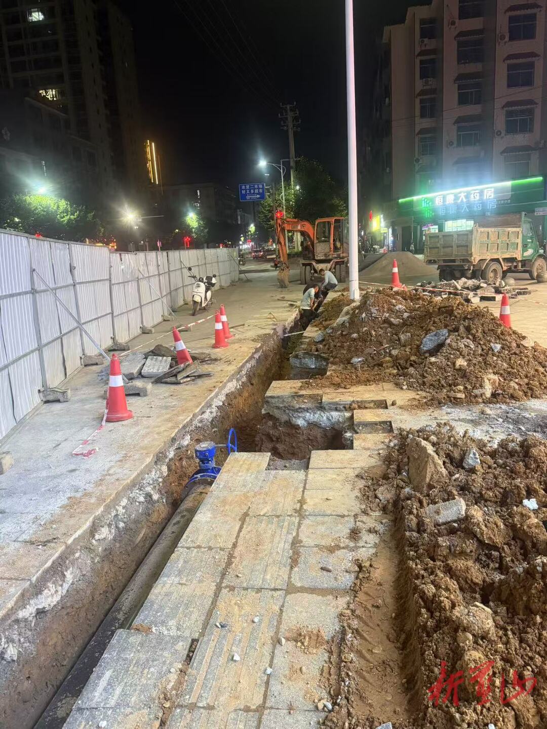 11月12日晚11时,在蓝山县湘粤路与南平路交汇口,蓝山县自来水公司的工作人员正忙碌地进行管网改造搭口施工。此次湘粤中路管网改造旨在有效降低管网漏损率,减少水资源的浪费,同时提高供水压力和水质,确保居民能享受到更优质的用水体验,此举将显著提升该路段的供水质量。