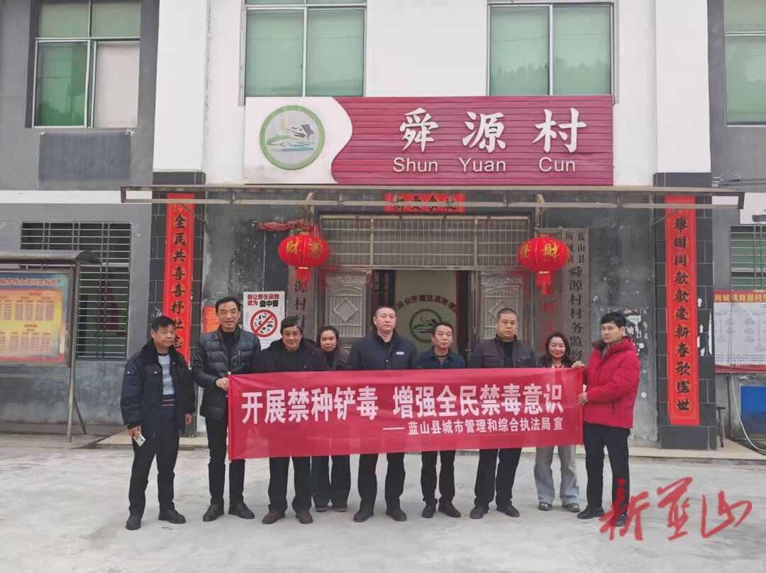 2月11日,蓝山县城市管理和综合执法局党员志愿者深入所城镇舜源村开展禁毒宣传咨询活动。