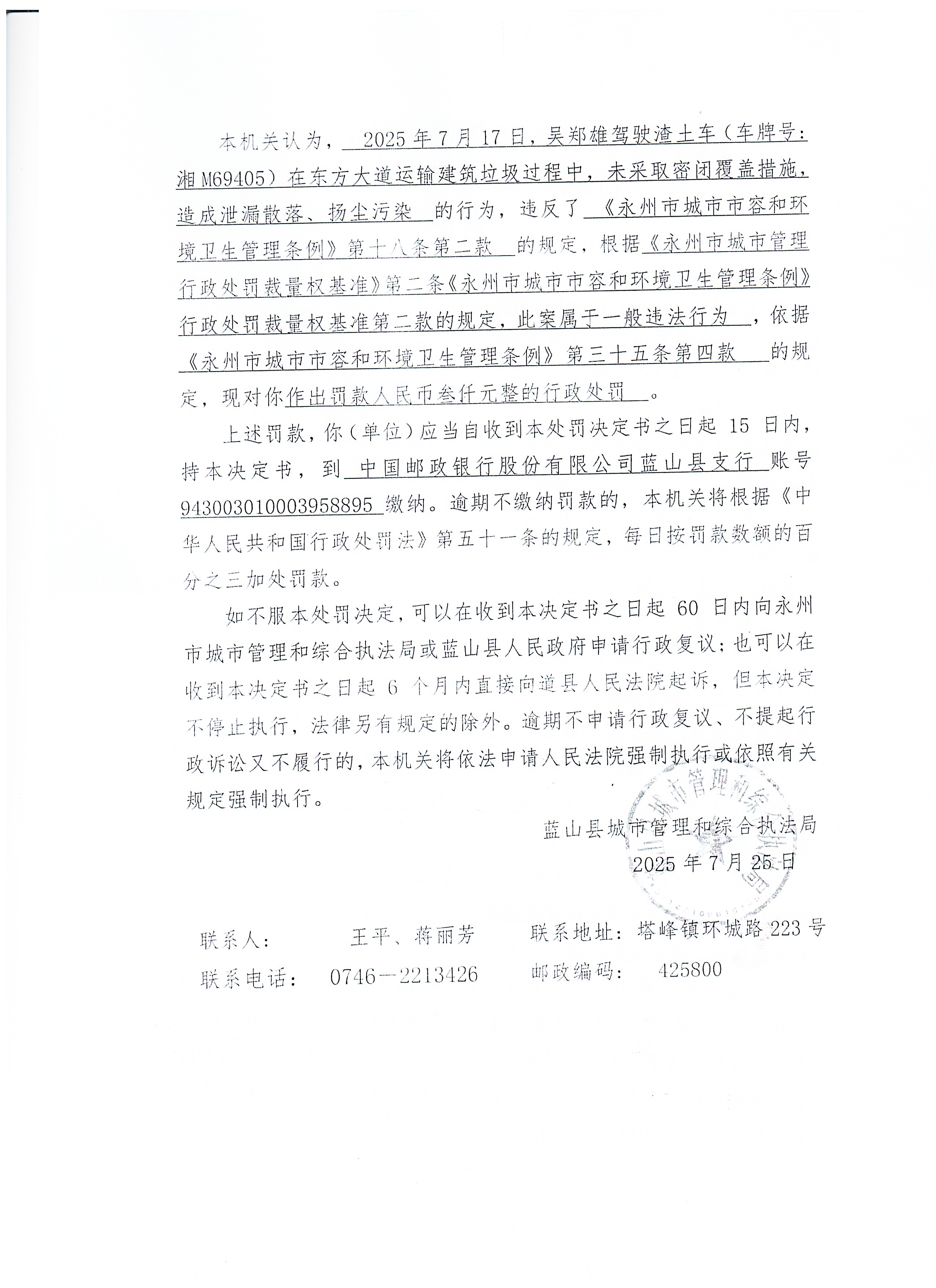 发文机关: 蓝山县城市管理和综合执法局 发文日期: 2025-07-25
