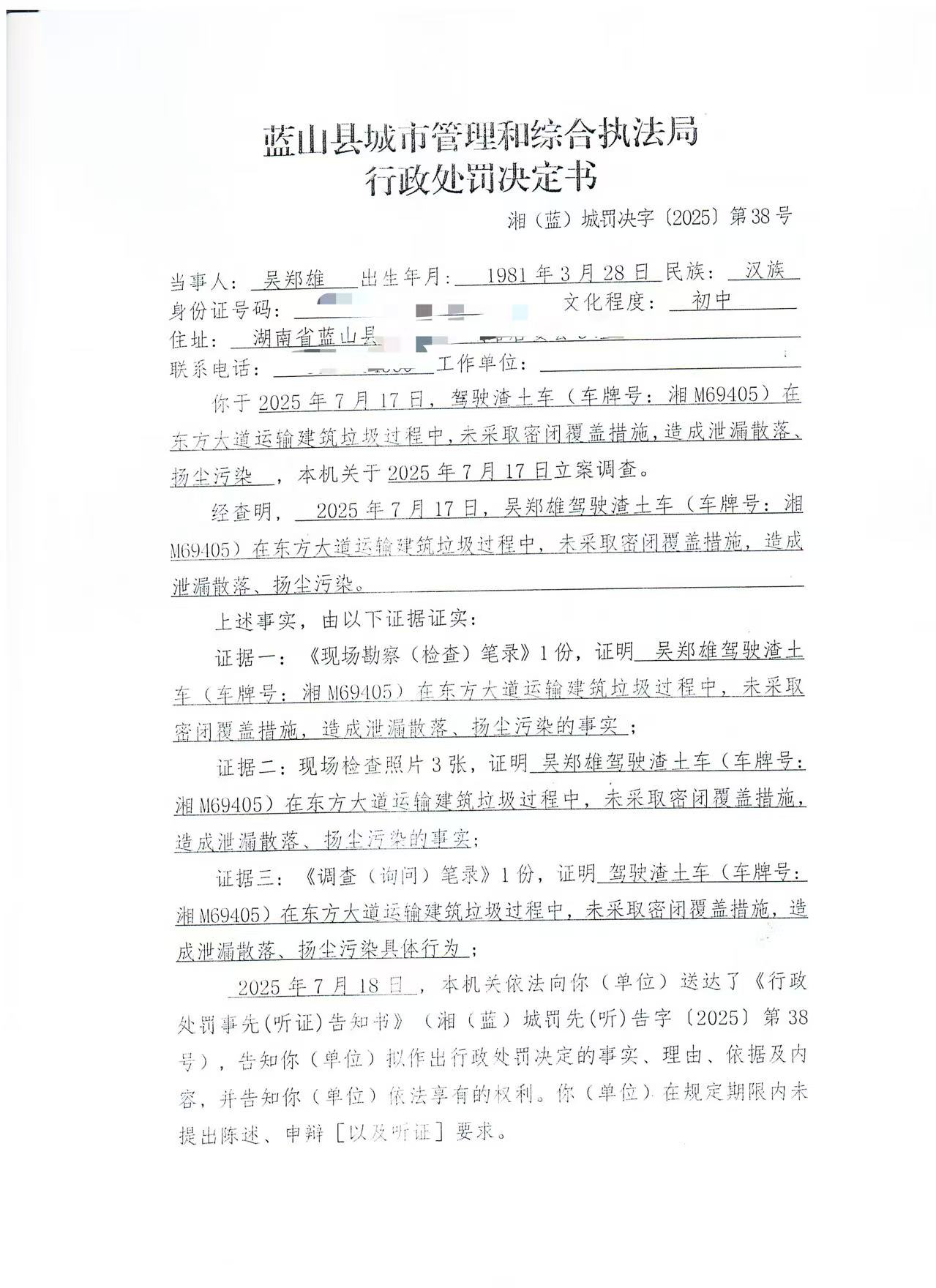 关于对吴郑雄驾驶 渣土车在东方大道运输建筑垃圾过程中,未采取密闭覆盖措施,造成泄漏散落、扬尘污染行为的处罚