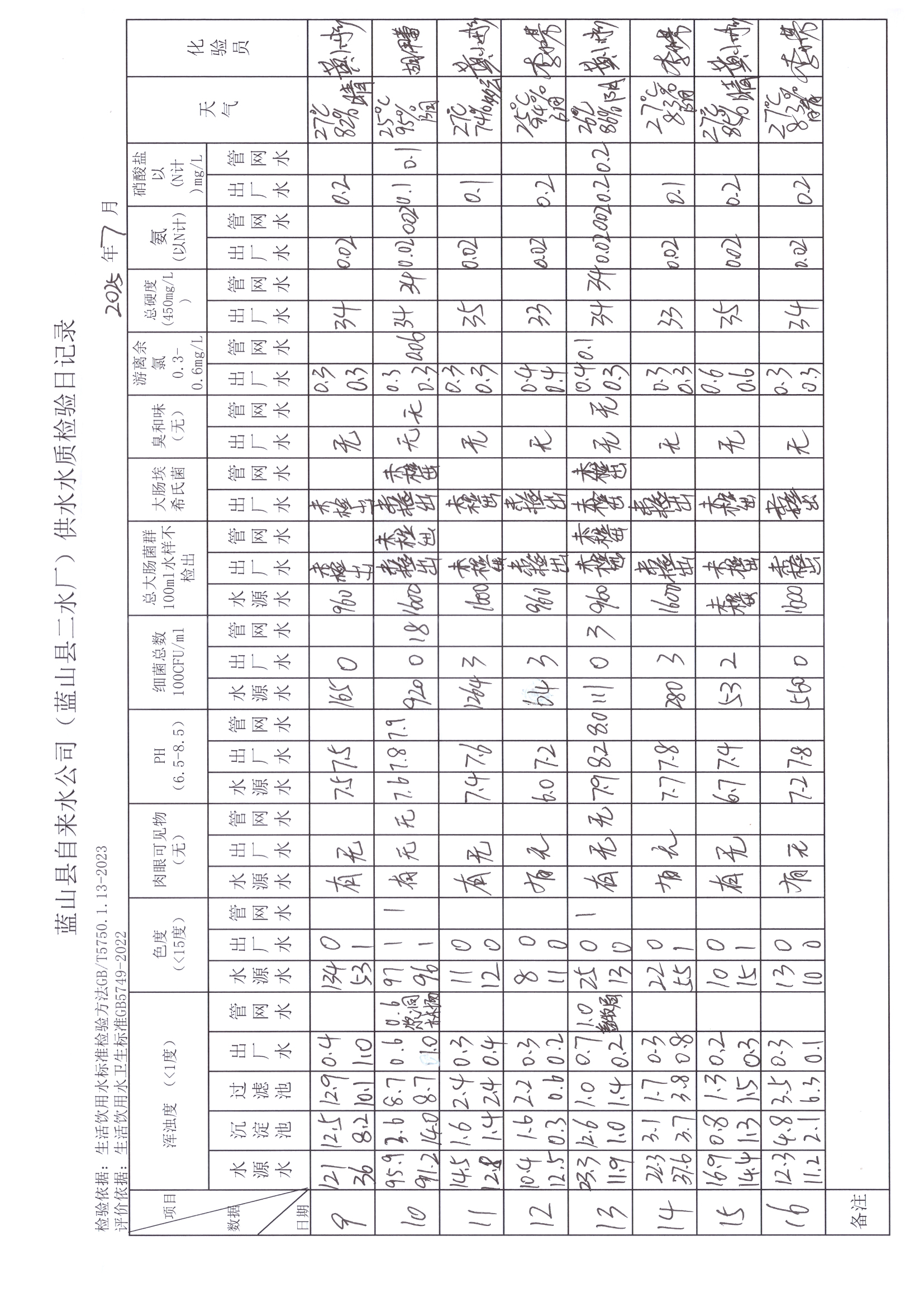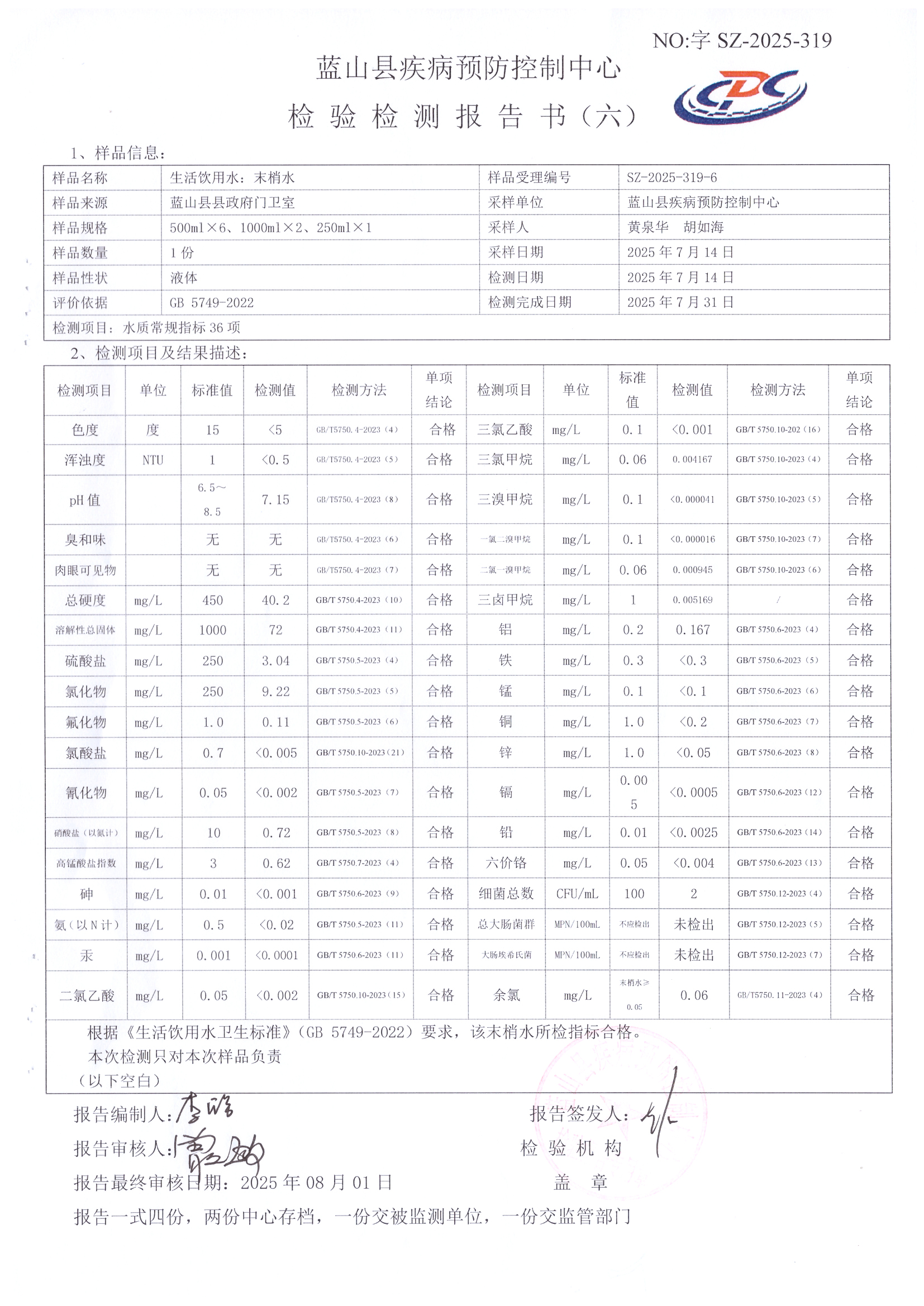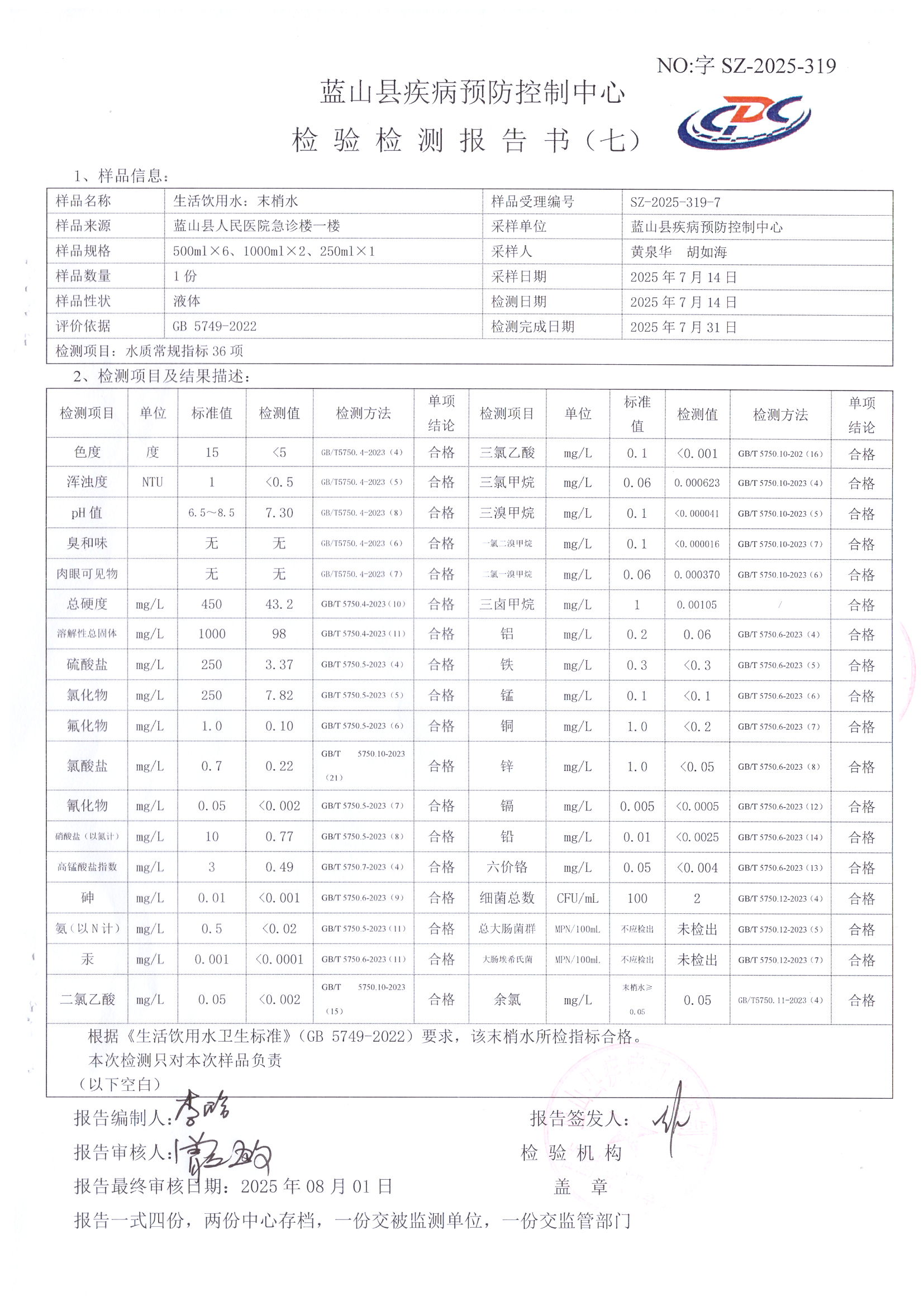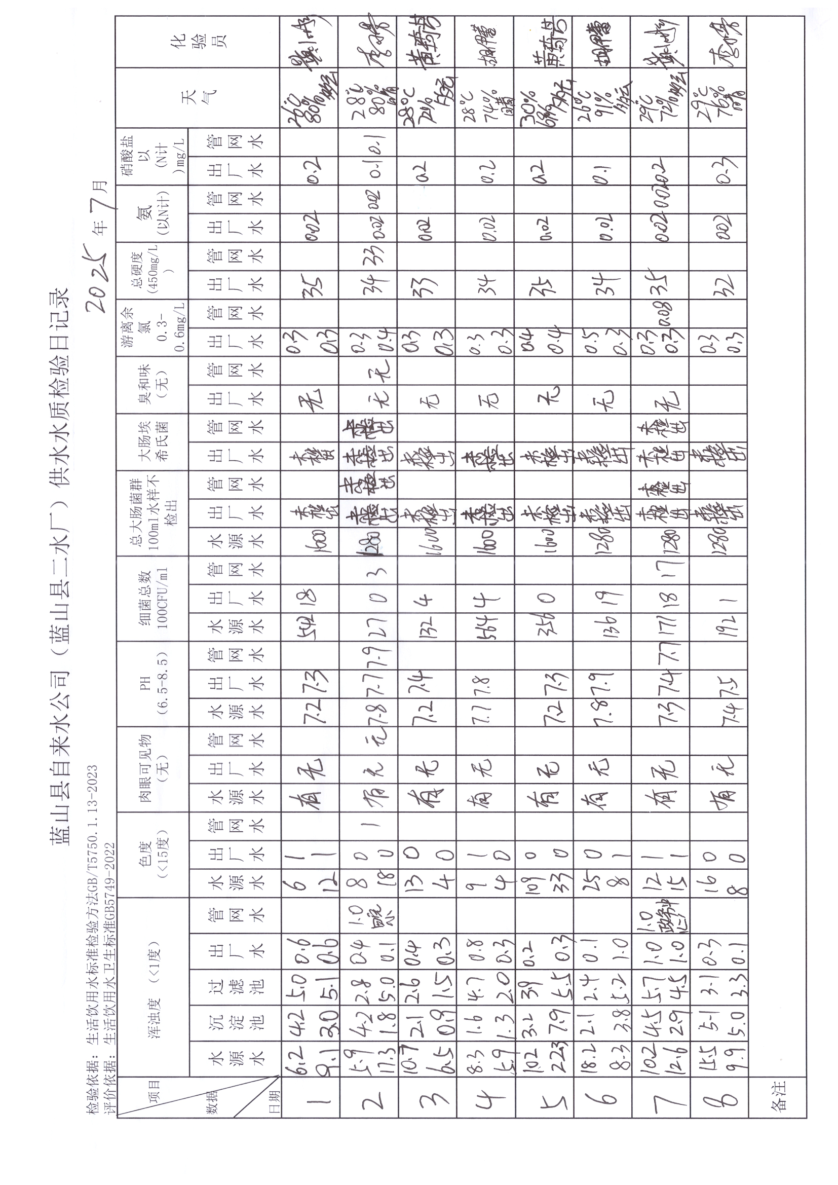 2025年7月份市政管网生活饮用水水质监测结果公示