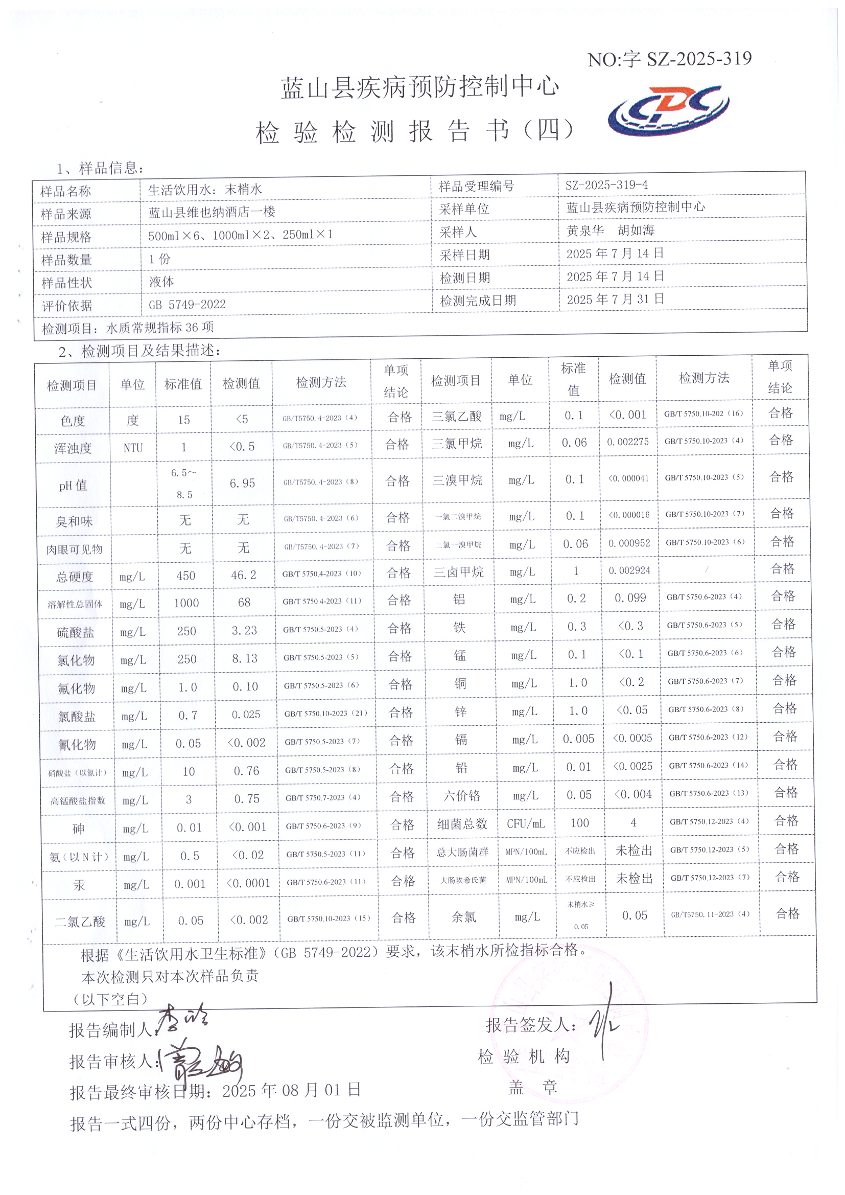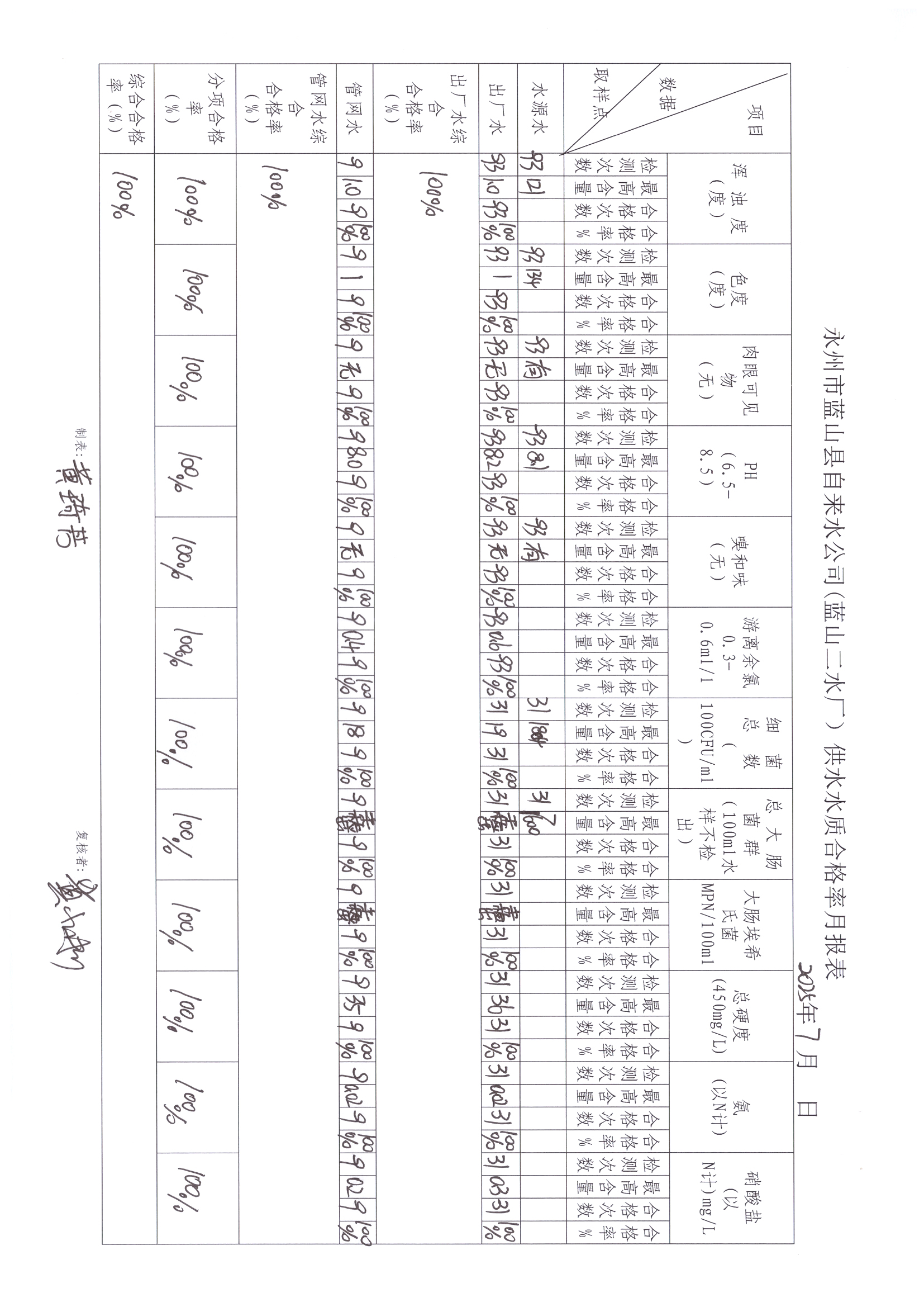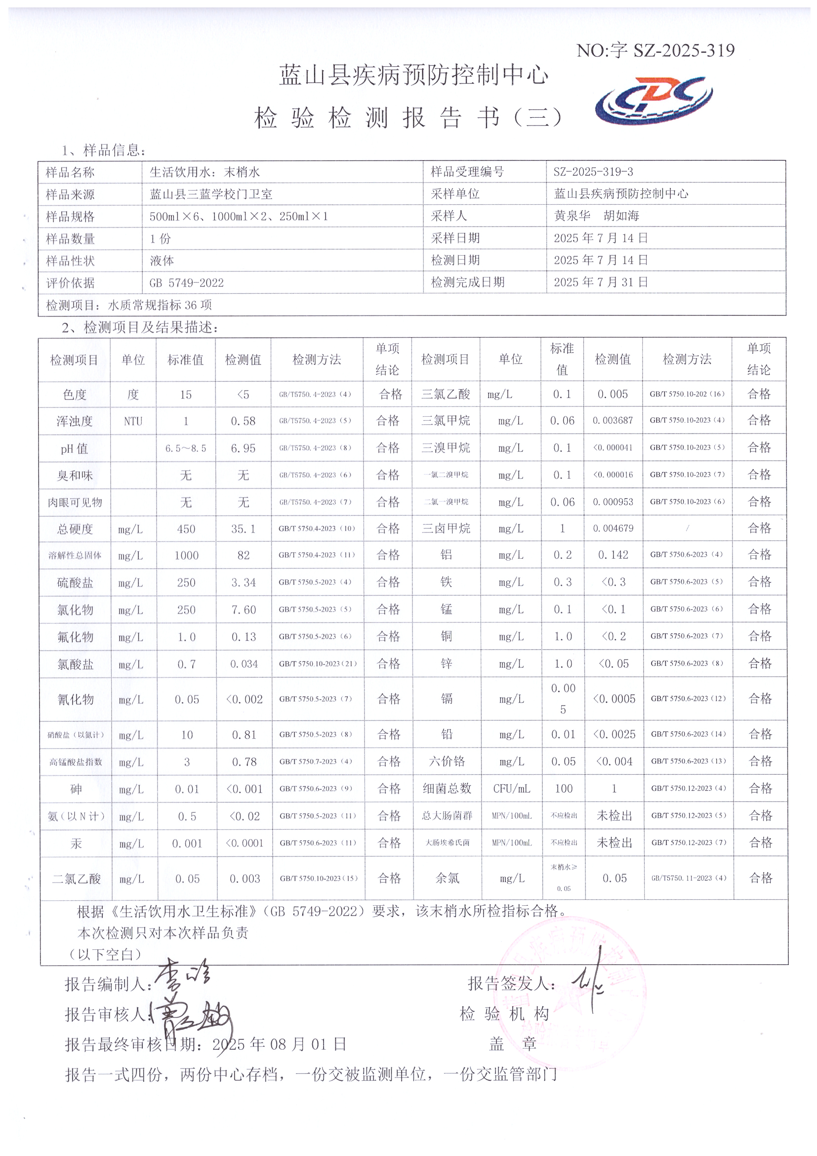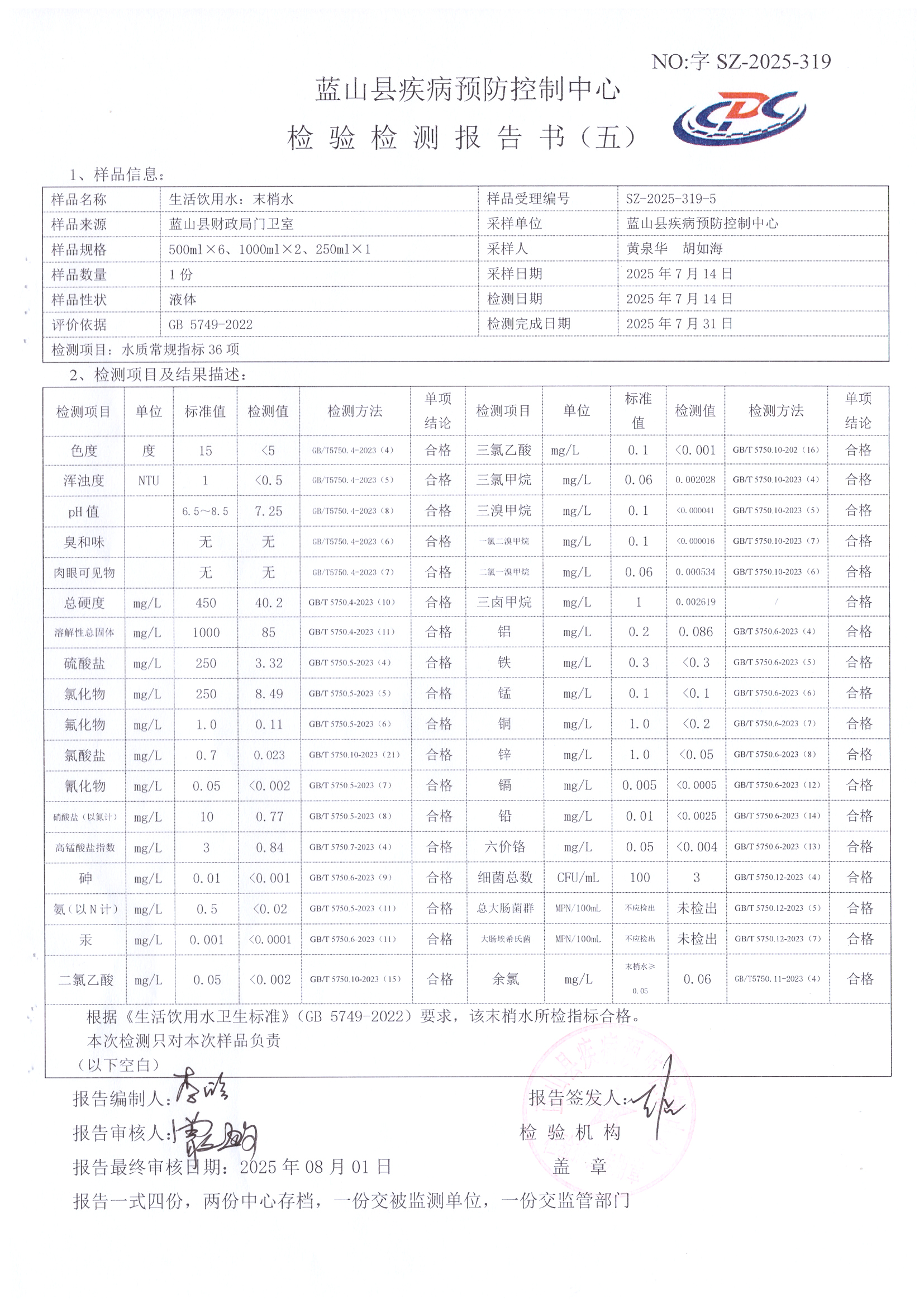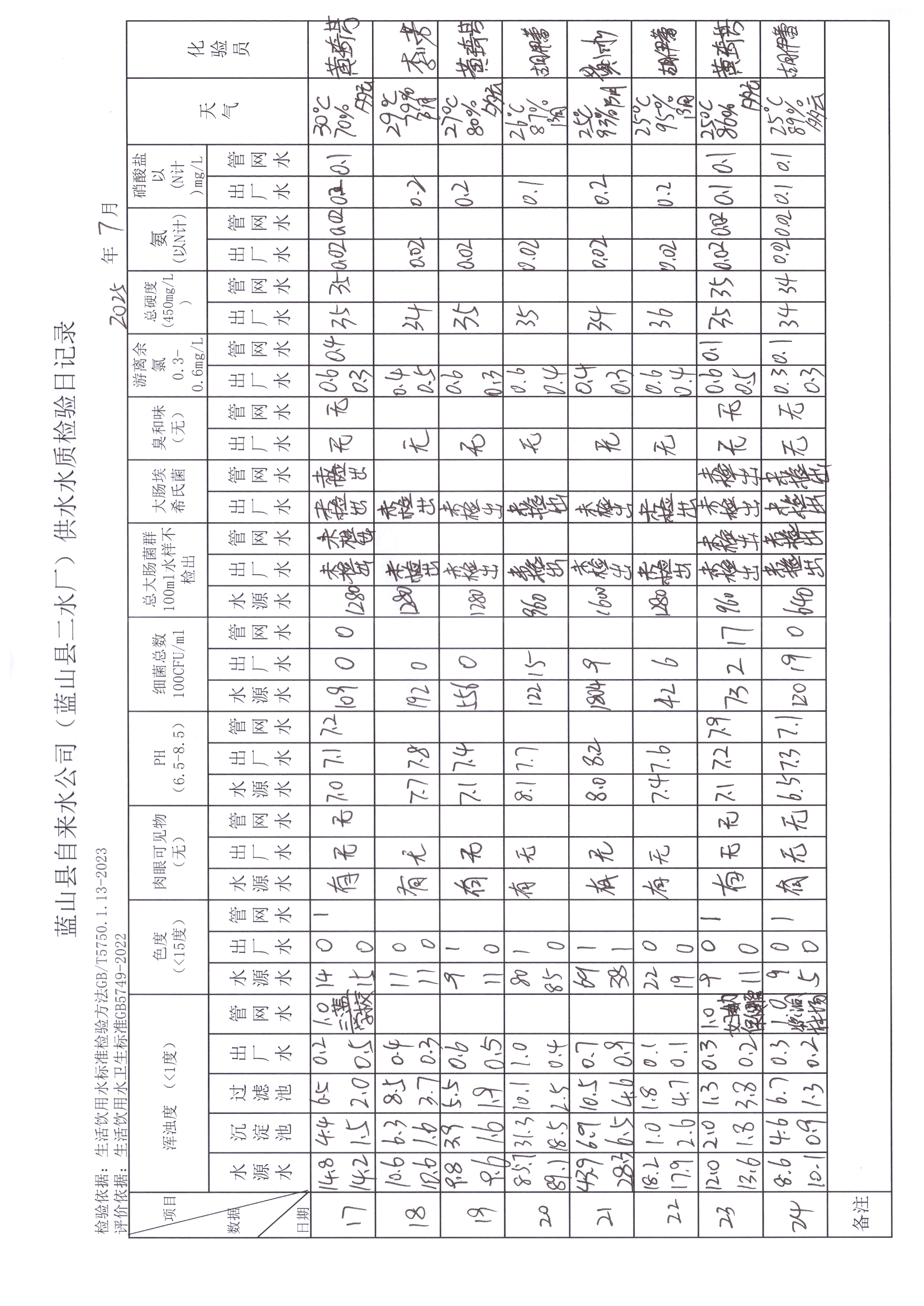 2025年7月份市政管网生活饮用水水质监测结果公示
