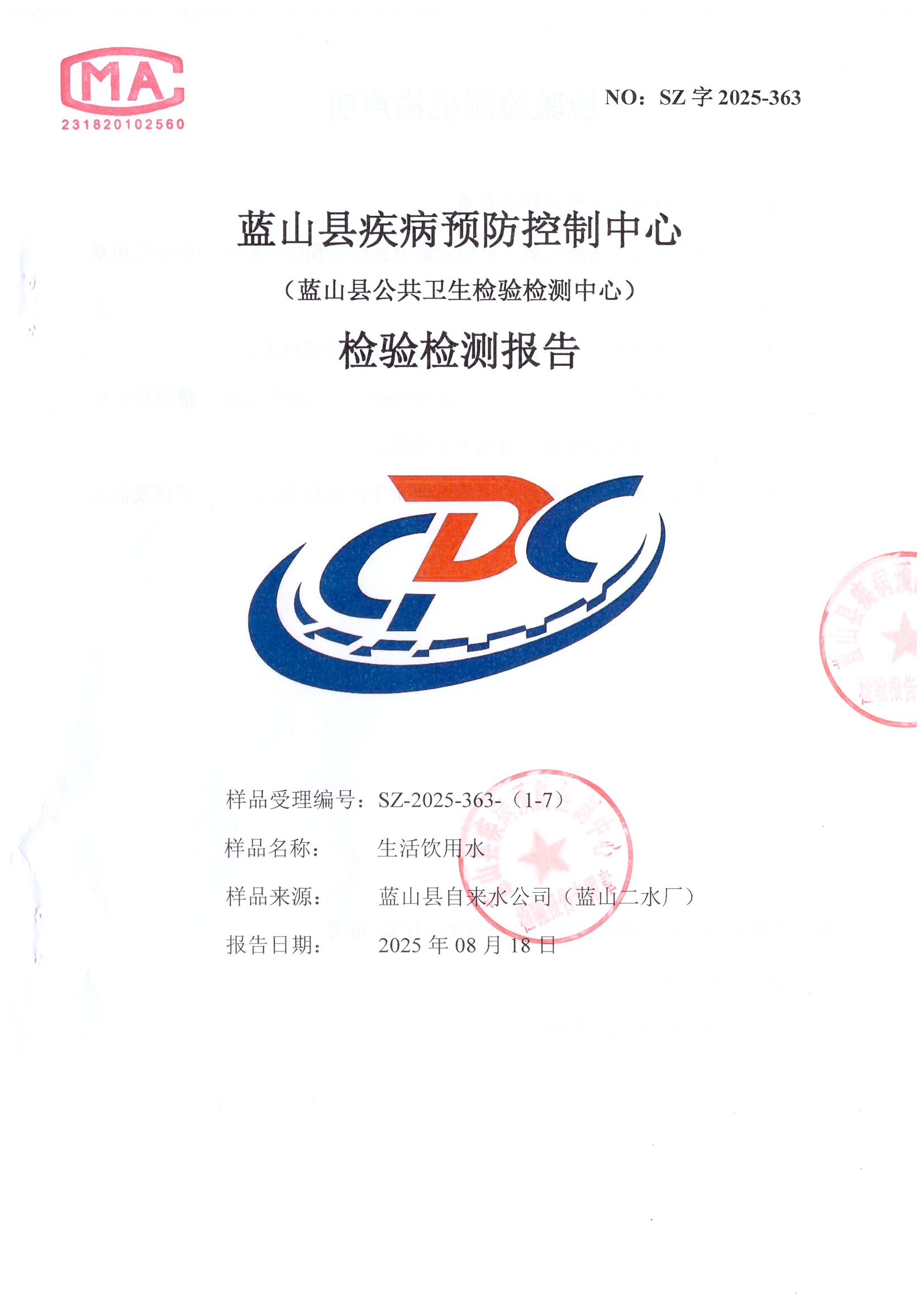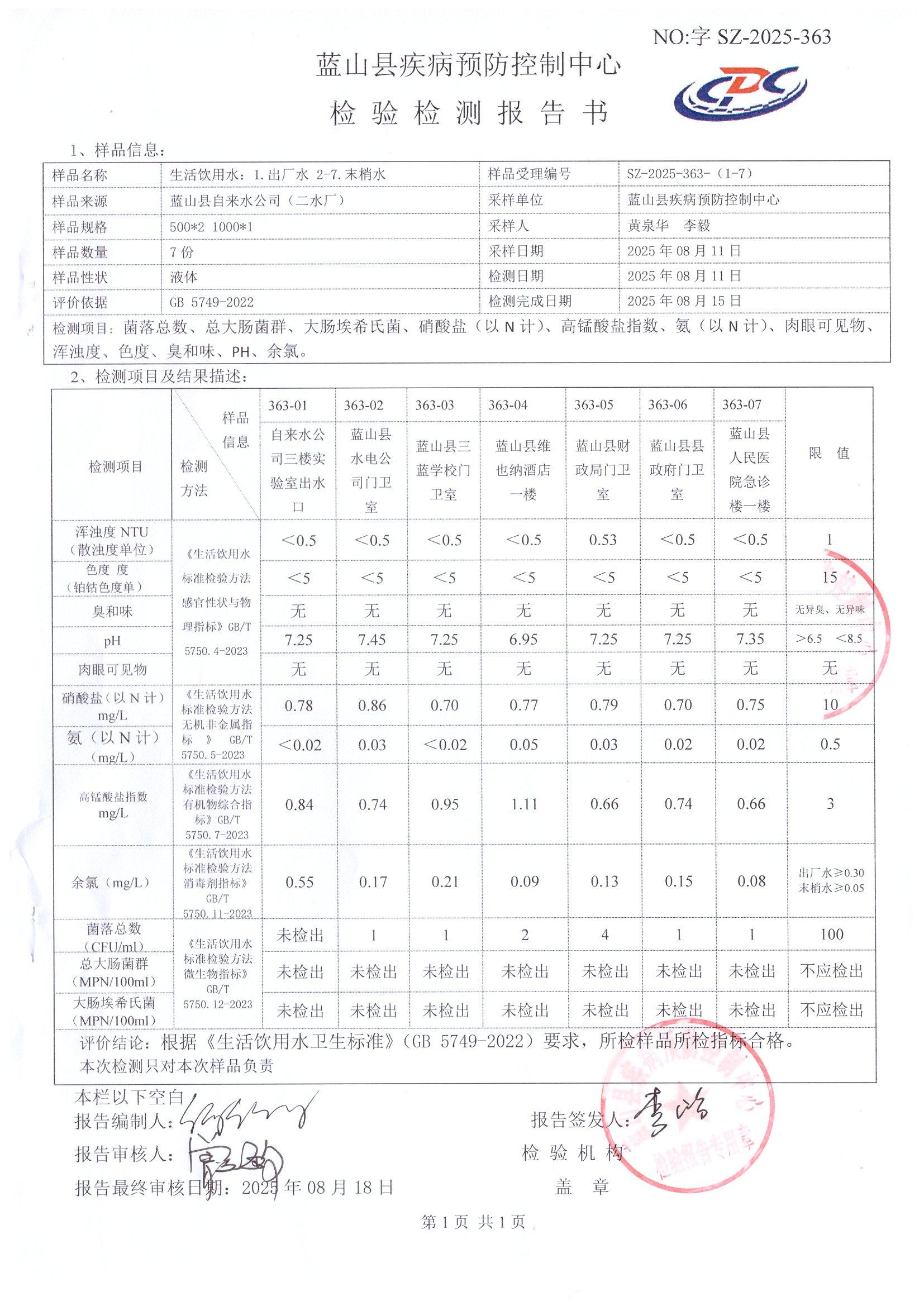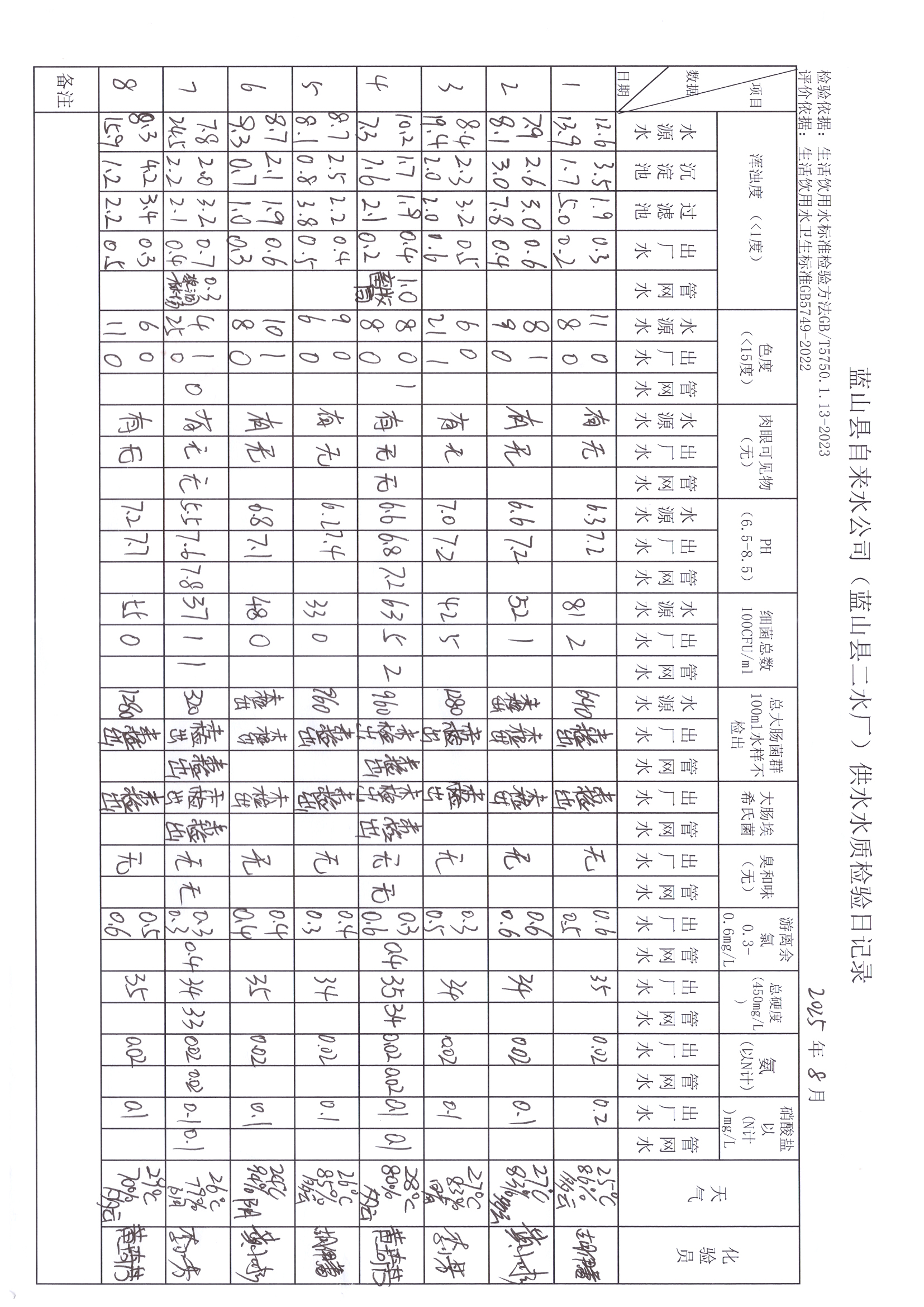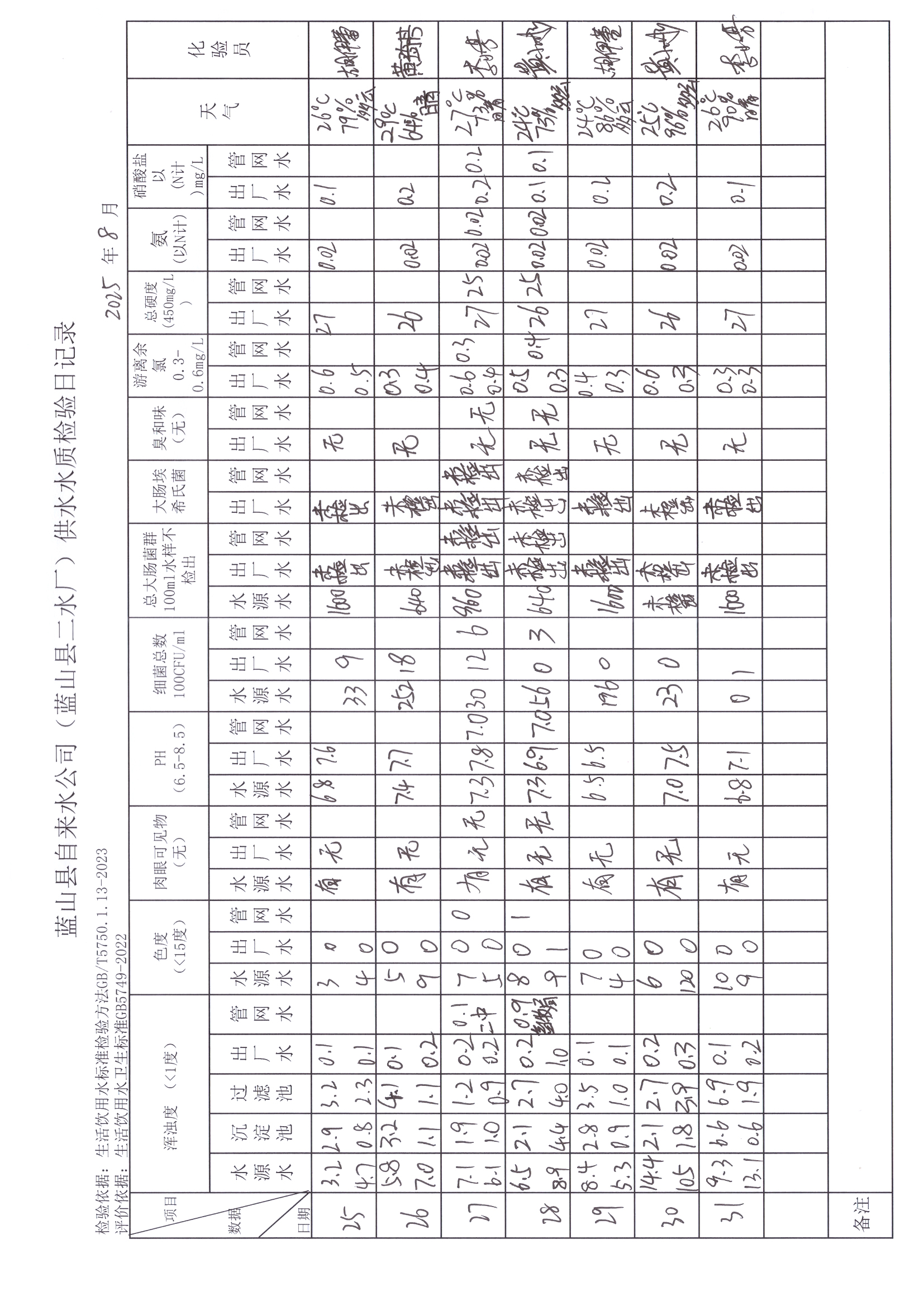 2025年8月份市政管网生活饮用水水质监测结果公示
